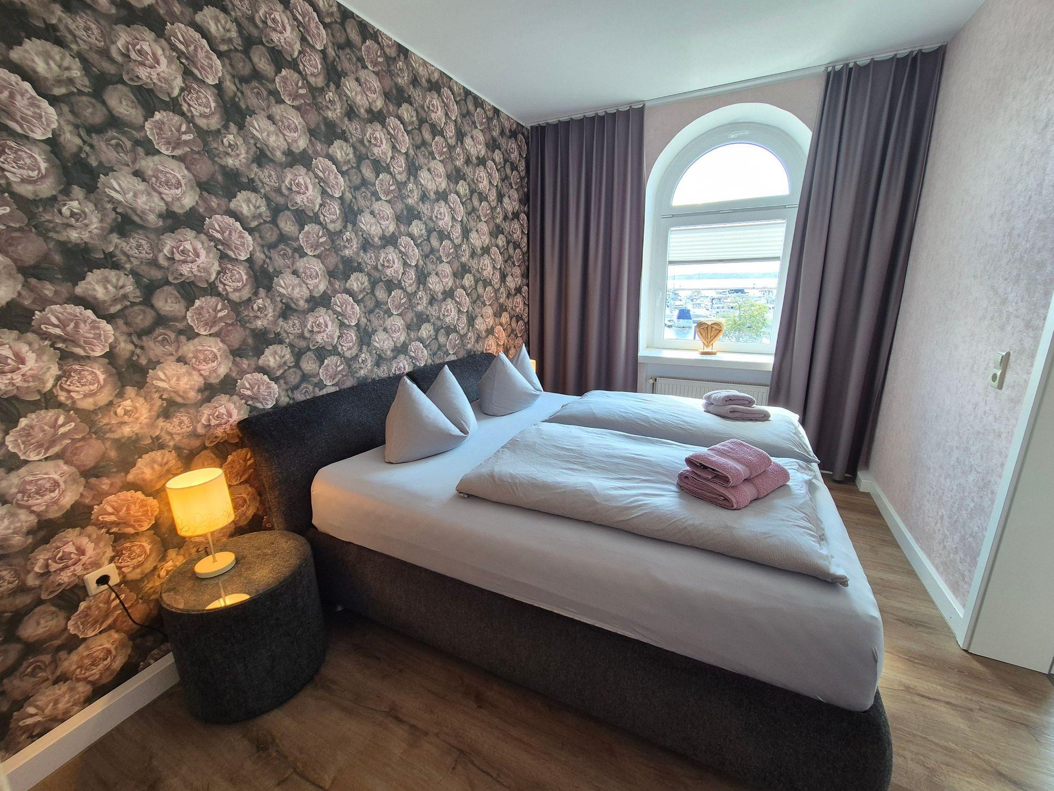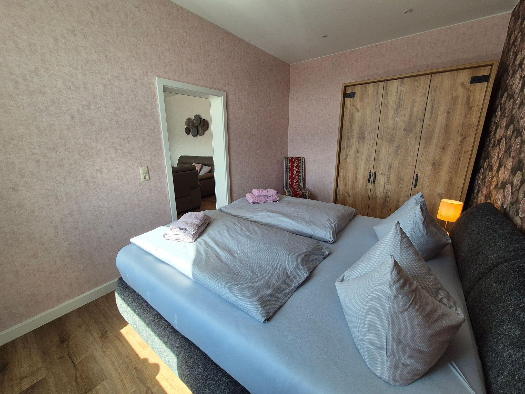 Vom Wohnzimmer aus gelangen Sie in das Schlafzimmer, das mit einem komfortablen Doppelbett, einem geräumigen Kleiderschrank und ebenfalls einem herrlichen Blick über die Hafenanlage aufwartet.