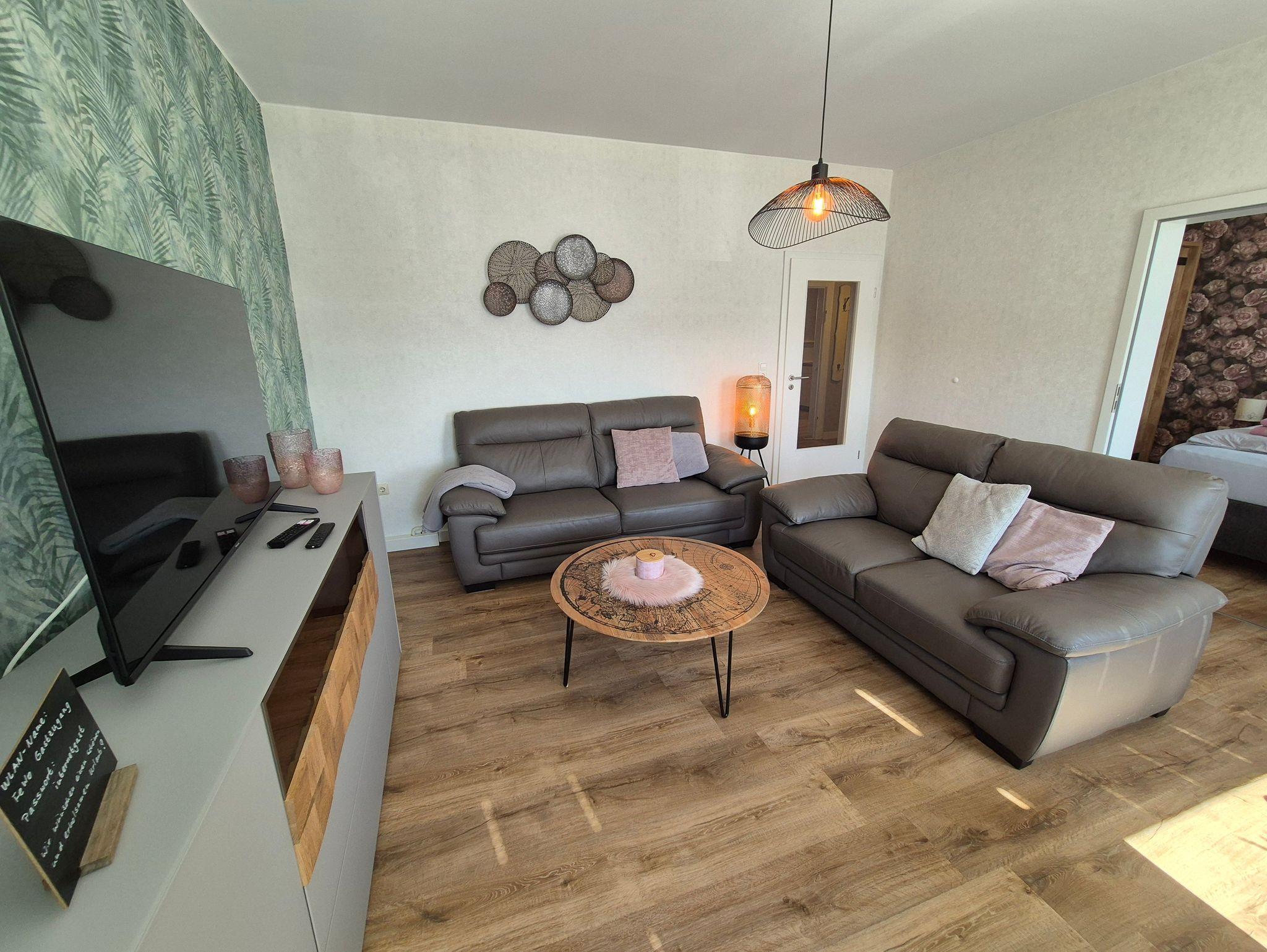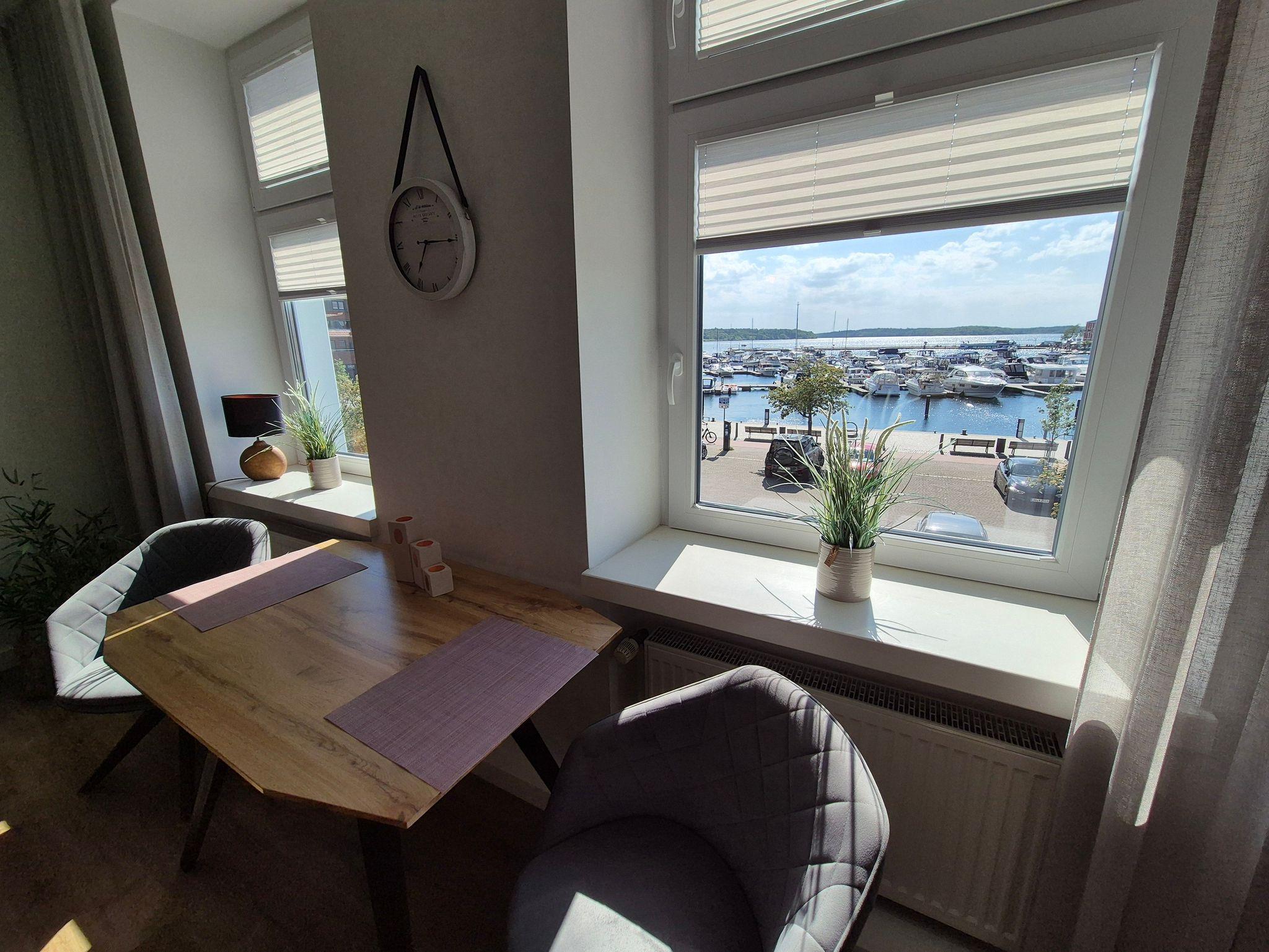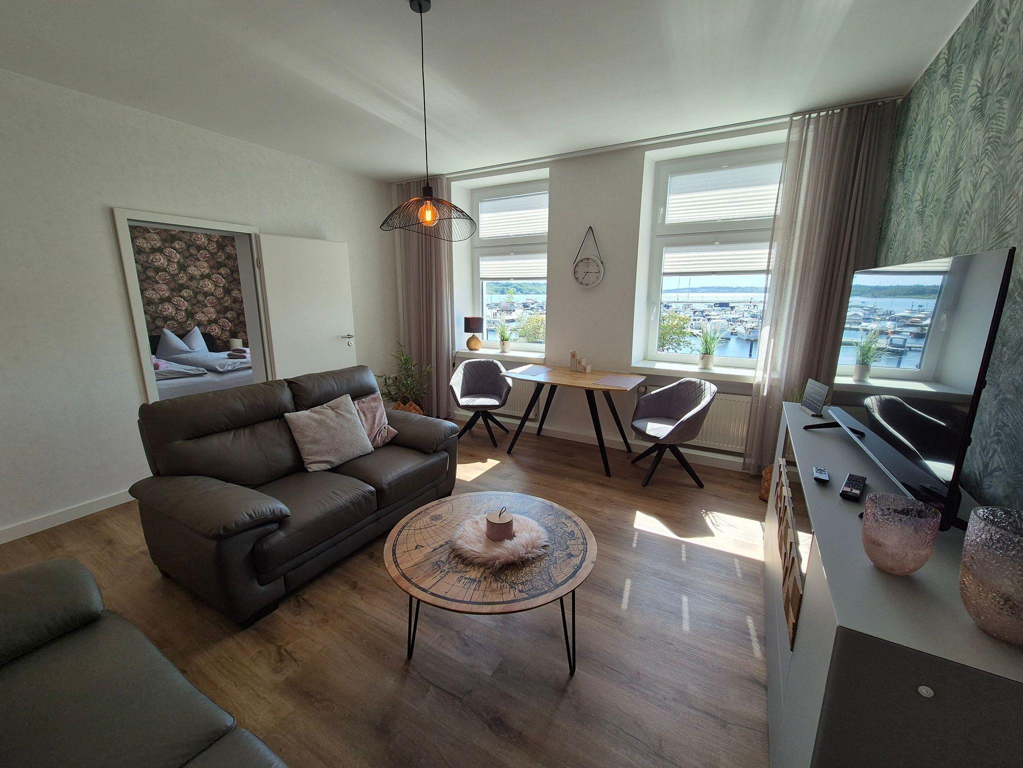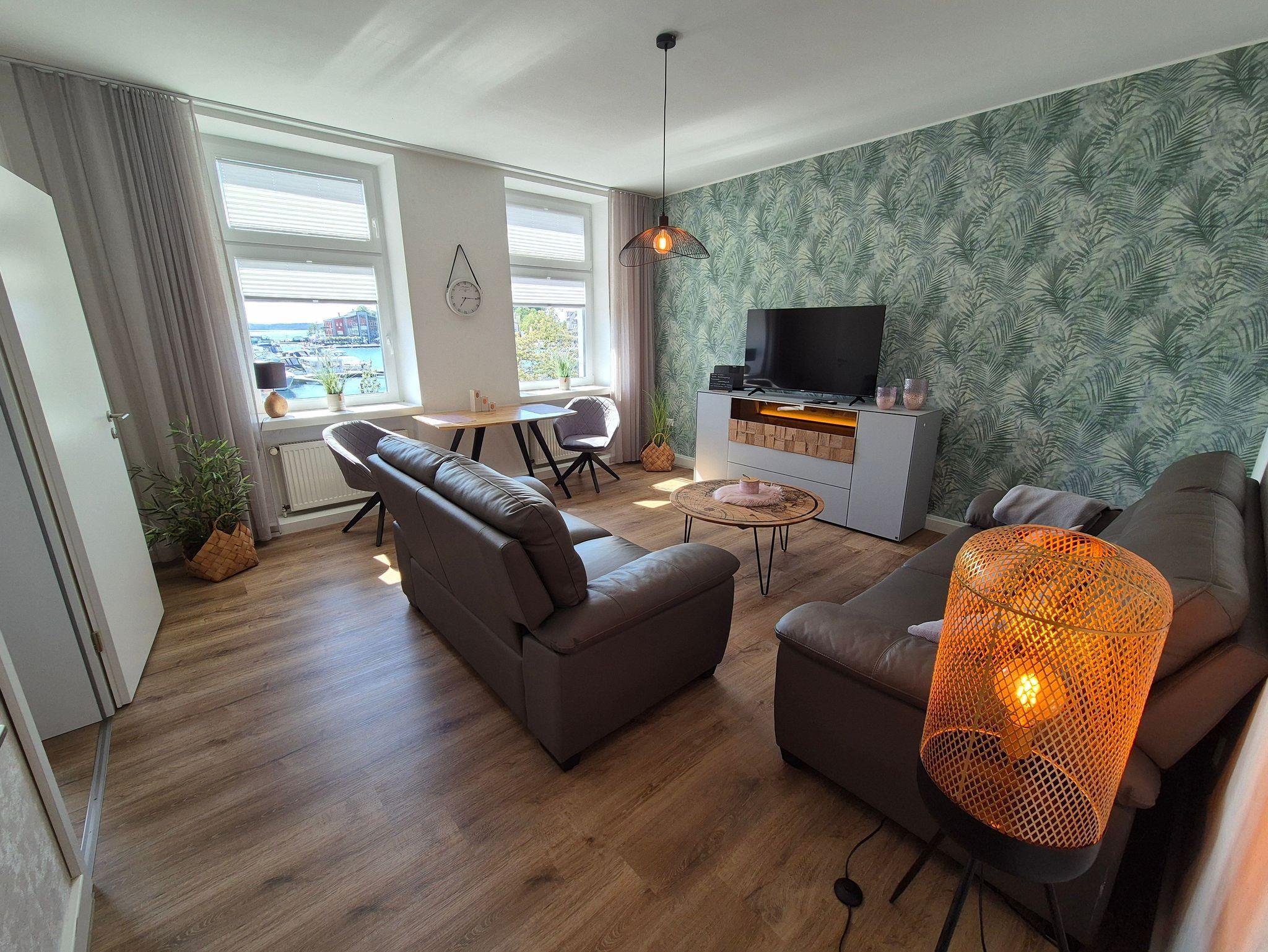 Das Wohnzimmer besticht durch eine gemütliche Couchlandschaft, einen Flachbild-TV und einen Fensterplatz mit fantastischem Panoramablick über den Hafen, die Altstadt und den Müritzsee. Hier können Sie entspannte Stunden verbringen und die Aussicht genießen.