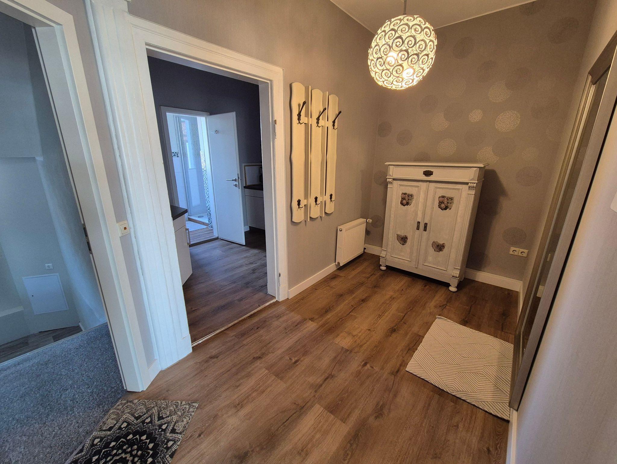 Diese charmante Ferienwohnung im 1. Obergeschoss eines Stadthauses direkt am Hafen empfängt Sie mit einem einladenden Eingangsbereich, ausgestattet mit Garderobe und Schuhablage.
