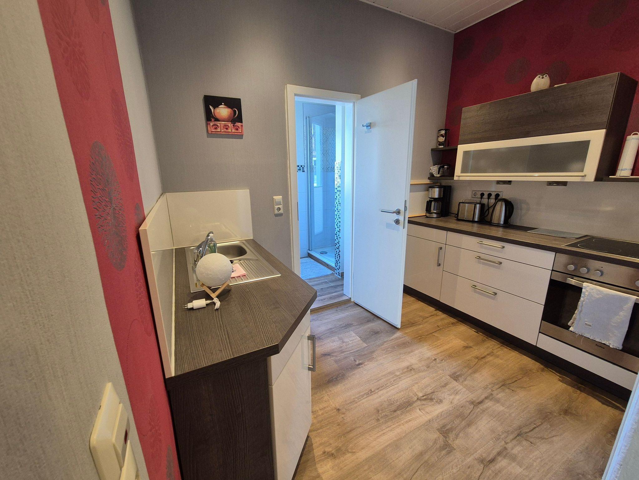 Die innenliegende kompakte Küche bietet allen Komfort mit modernen technischen Geräten und dient als Durchgangszimmer zum Badezimmer. Das Badezimmer ist mit Dusche und WC ausgestattet.