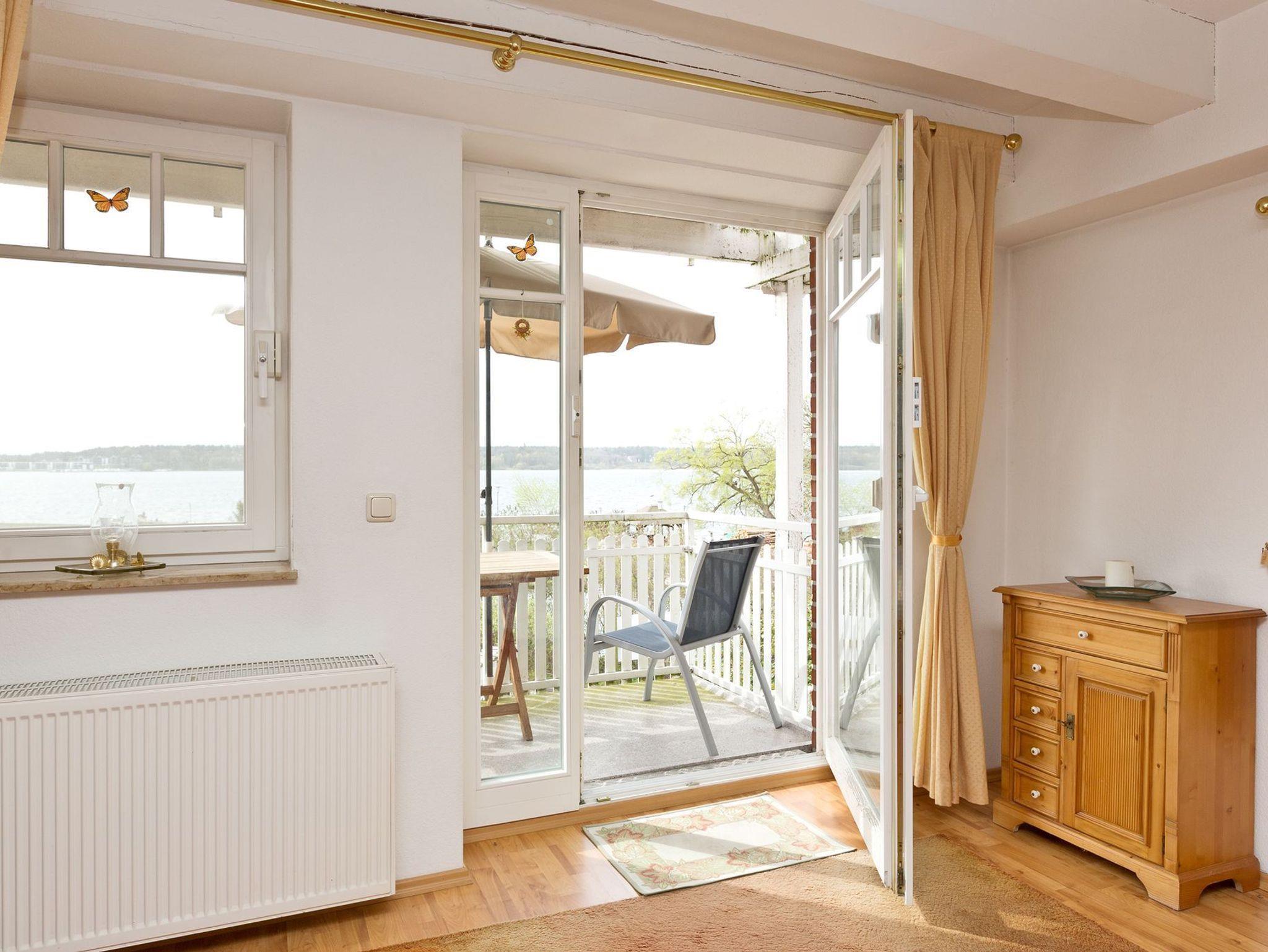 Die schöne Balkon bietet einen schönen Blick auf die Müritz und ist mit einem Sonnenschirm und Balkonmöbeln ausgestattet.