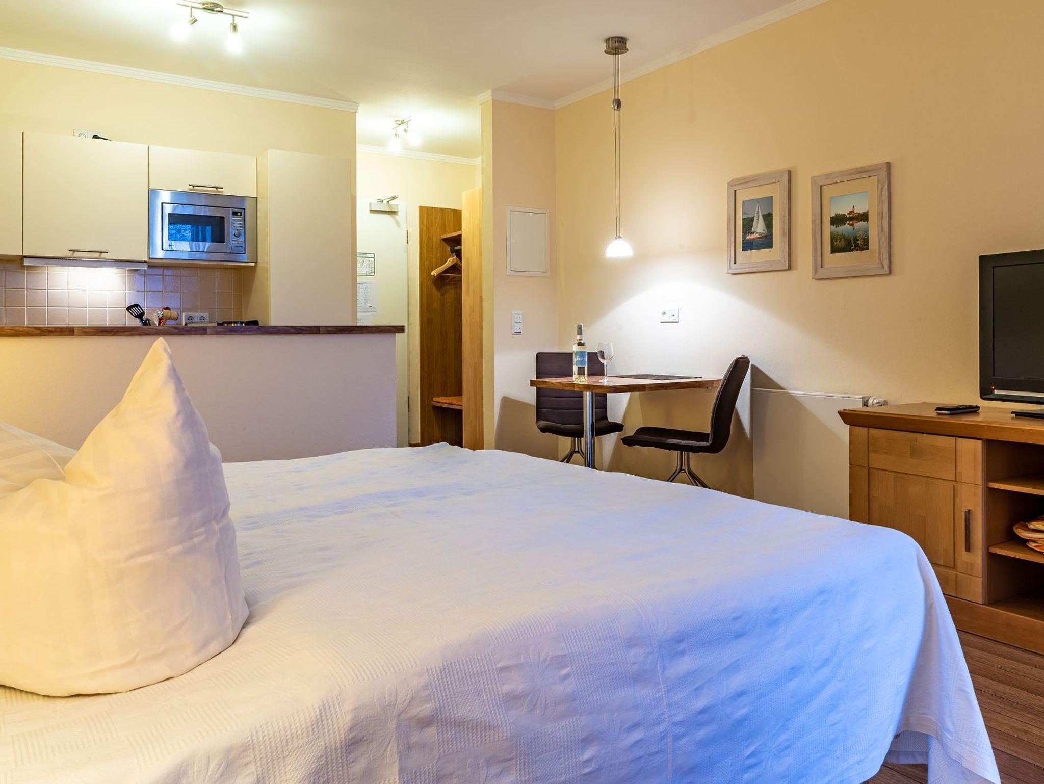 Bei der Erstellung und der Einrichtung des Neubaus wurde großer Wert auf die Bedürfnisse unserer Gäste gelegt. So verfügt das Appartement, was sich im Erdgeschoss befindet, über einen unverbauten Blick direkt auf den Hafen und von Ihrem Balkon wird so mancher schöner Sonnenuntergang mit der Hafenkulisse und dem weiten Blick über die Müritz in guter Erinnerung bleiben.