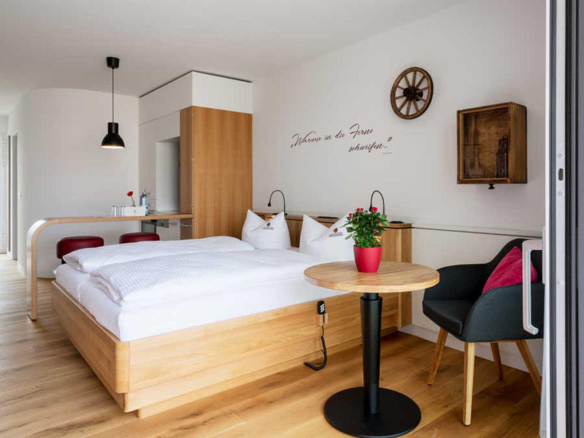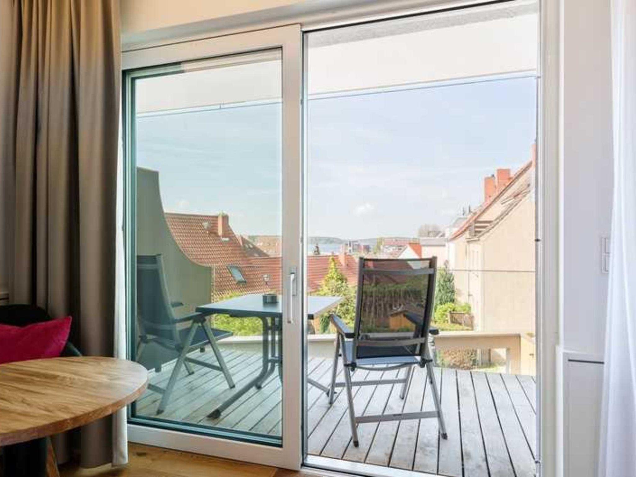 Die Suite Milchhändler Zock befindet sich im Obergeschoss des Hauses und verfügt über einen kombinierten Wohn-/Schlaf und Essbereich mit offener Küche und einen Balkon: 7 qm (Müritzblick Südseite).