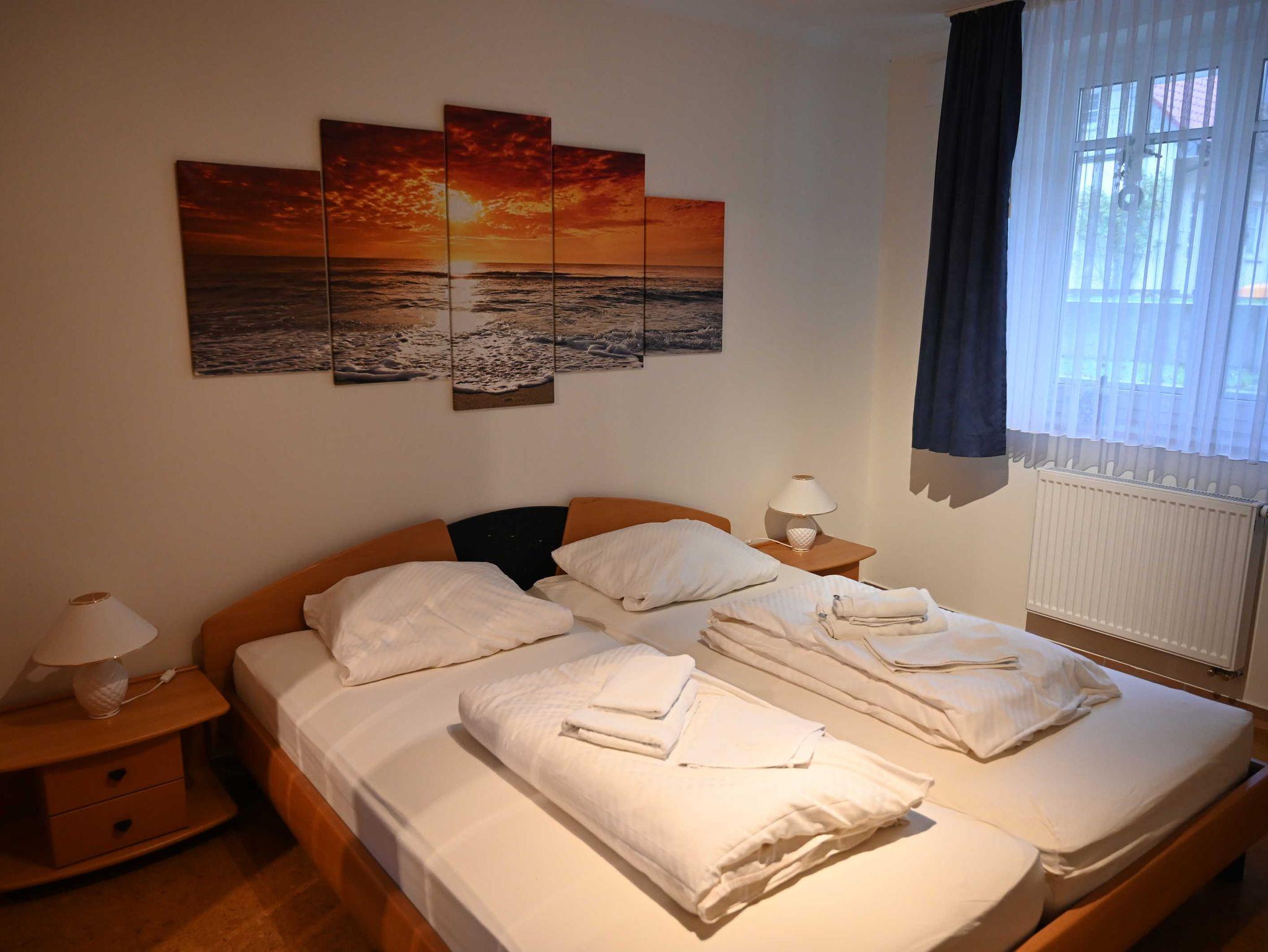 Die Ferienwohnung „Seeblick II“ ist modern eingerichtet. Das Apartment verfügt über ein Schlafzimmer, ein Bad mit einer Dusche und einen großen Wohnbereich mit einer offenen, komplett ausgestatteten Küche. In der gesamten Ferienwohnung sind Bodenfliesen verlegt, außer im Schlafzimmer ist ein Korkfußboden. Der Wohnbereich, die Küche und das Bad sind mit einer Fußbodenheizung ausgestattet.