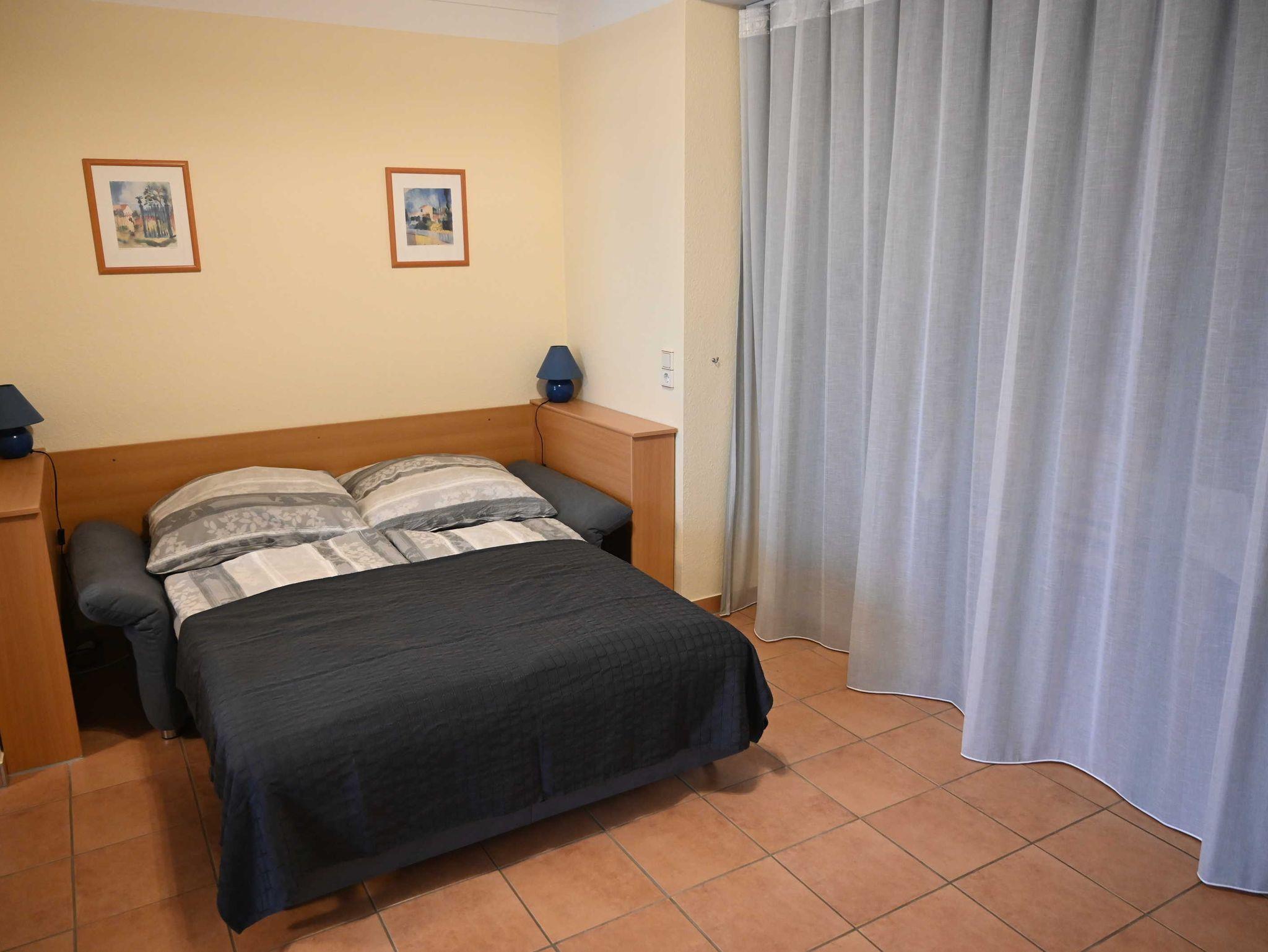 Das Schlafsofa im Mittelteil zwischen Küche und Wohnbereich kann zu einem Bett (1,30m breit) ausgeklappt werden. Mit einer Gardine kann dieser Bereich auch von der Küche abgetrennt werden.
