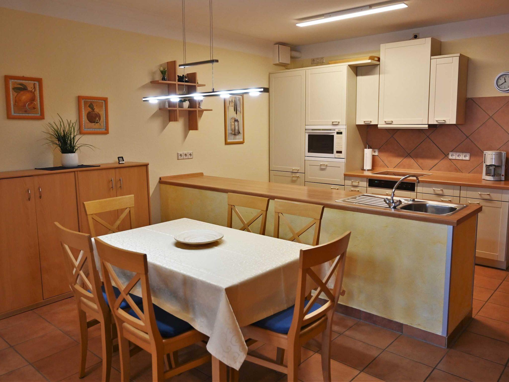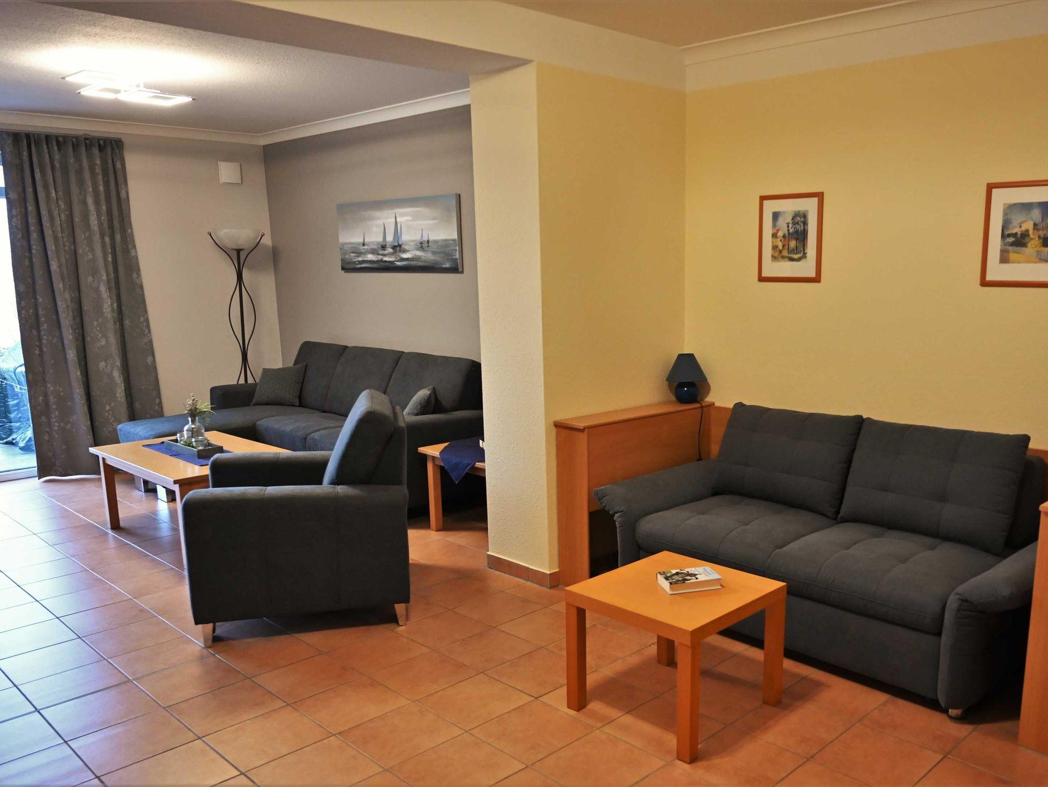 Im Wohnbereich steht eine große Couch, ein Sessel und eine moderne Wohnwand. Ansprechende Dekorationen geben der Ferienwohnung ein Ambiente, in dem Sie sich wohlfühlen werden.