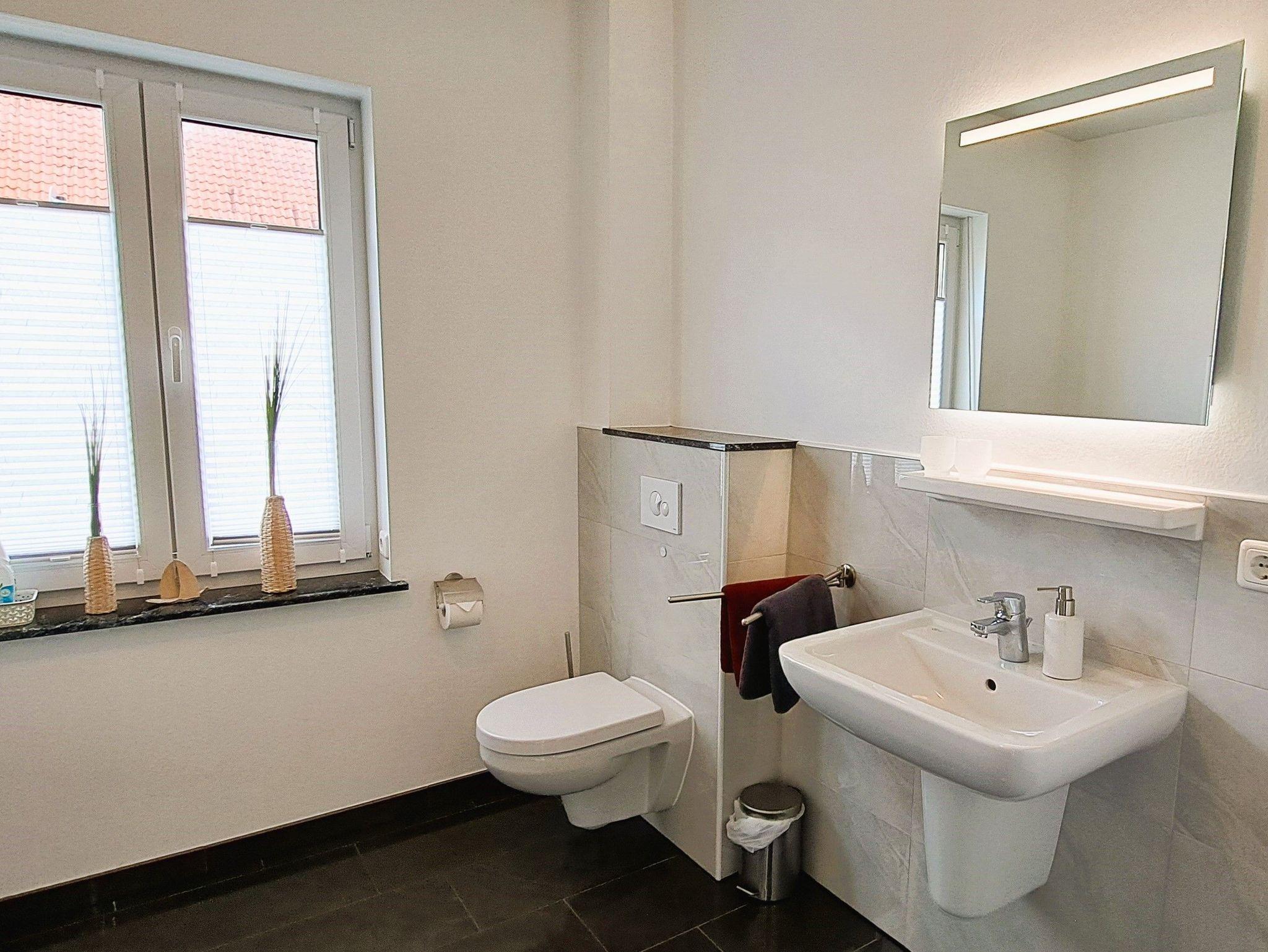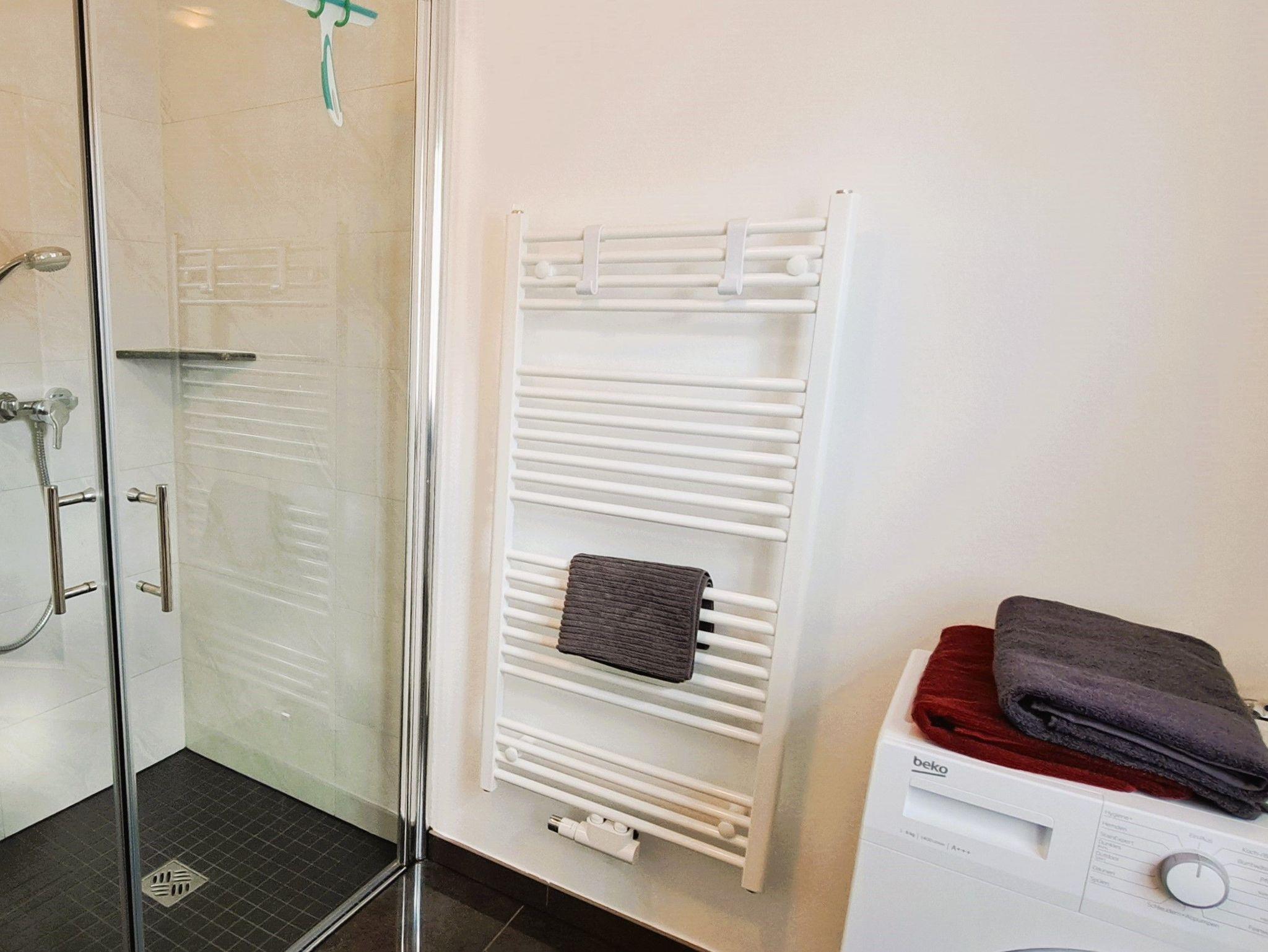 Im Tageslichtbadezimmer finden Sie eine ebenerdige Dusche, einen Waschtisch, eine Waschmaschine und eine Toilette. Diese moderne Ausstattung sorgt für Ihren Komfort während des Aufenthalts.