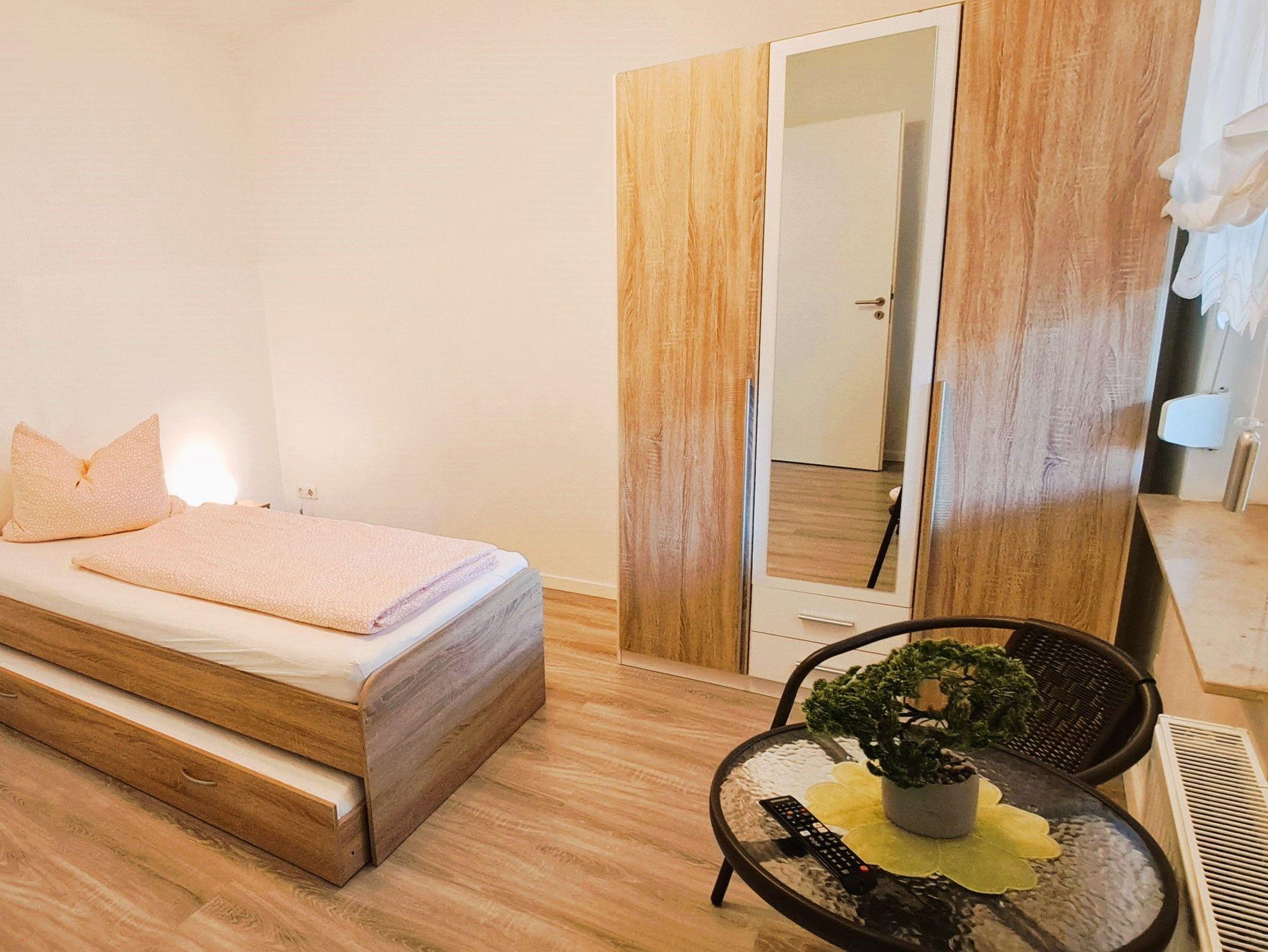 Das erste Schlafzimmer ist praktisch und komfortabel eingerichtet. Es verfügt über ein Einzelbett mit einem darunter hervorziehbaren Rollbett, was zusätzliche Schlafmöglichkeiten bietet. Ein TV im Zimmer sorgt dafür, dass Sie sich auch zurückziehen und entspannen können.
