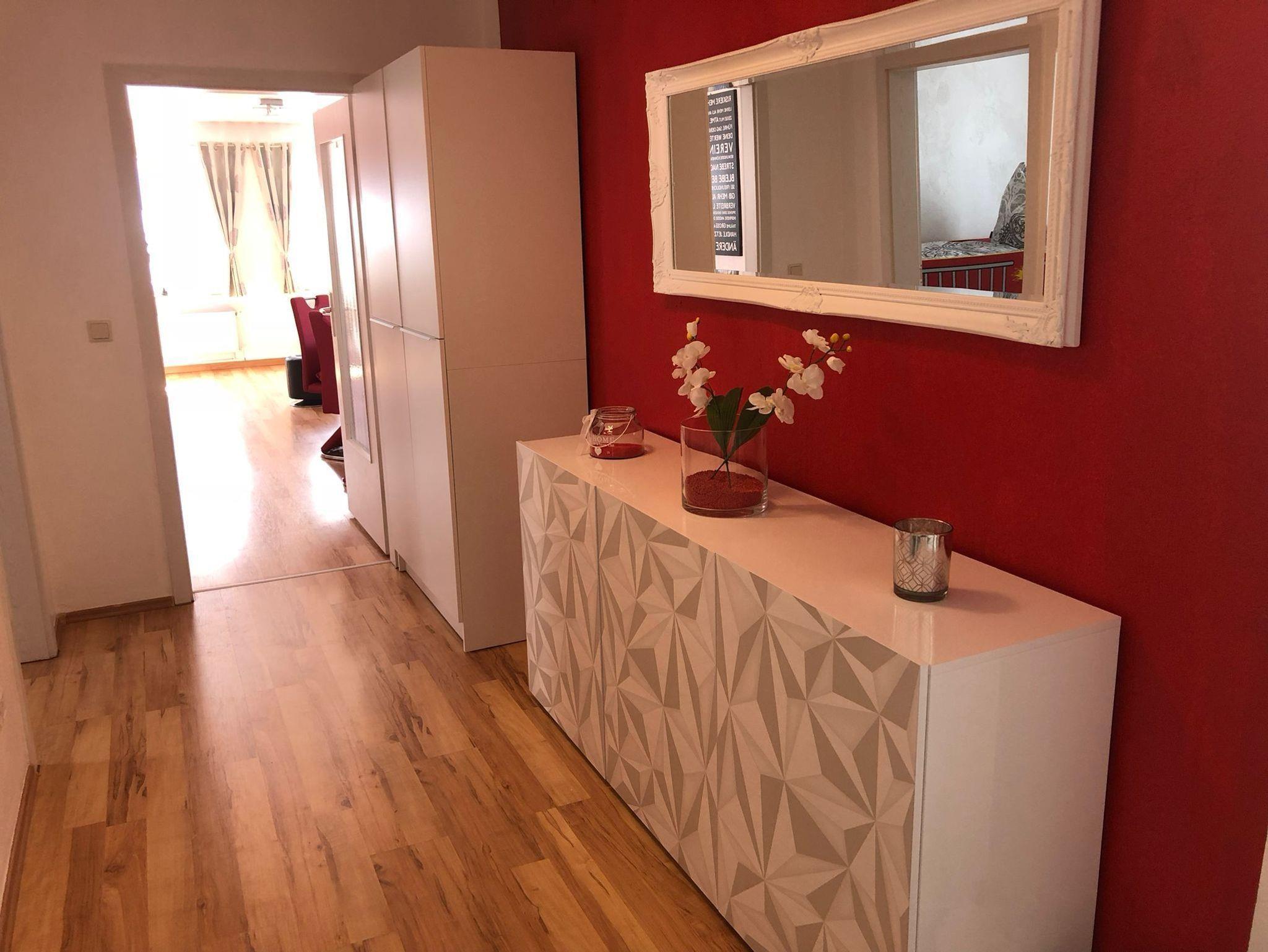 Das Apartment 3 liegt im zweiten Obergeschoss eines Apartmenthauses. Sie betreten die Ferienwohnung in einem hellen Flur, von dem die anderen Räume jeweils abgehen. Im Wohnzimmer hält eine große Wohnlandschaft ausreichend viel Platz für alle Gäste bereit. Die offene Küche ist mit Geschirrspüler, Cerankocheld, Backherd und Mikrowelle ausgestattet. Sie können dort am runden Esstisch gemeinsam Frühstücken. Oder Sie Frühstücken in einer der Bäckereien der Altstadt (nur 100m).