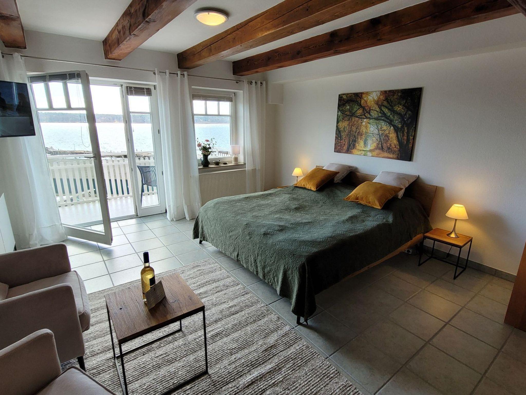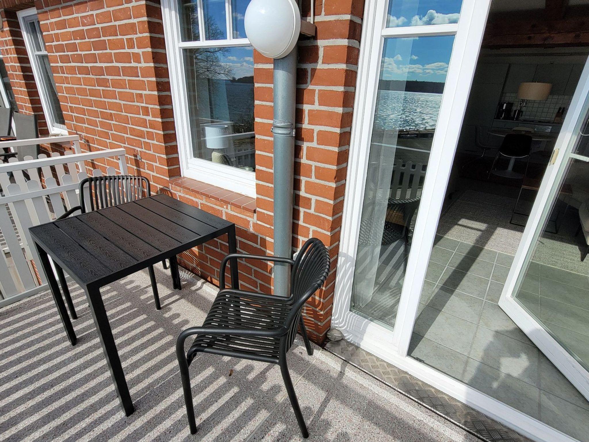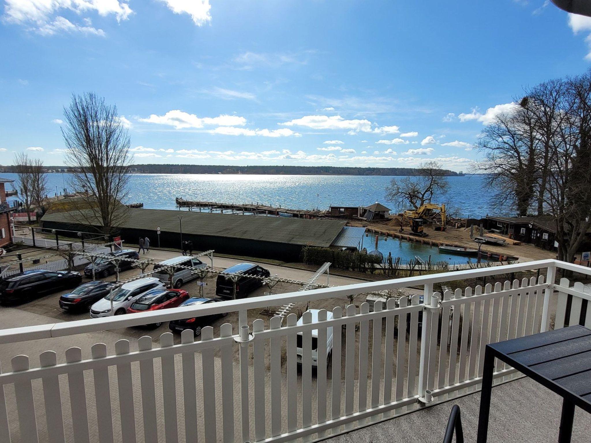 Der schöne Balkon bietet einen sonnigen Blick auf die Müritz und ist mit einem Sonnenschirm und Balkonmöbeln ausgestattet.