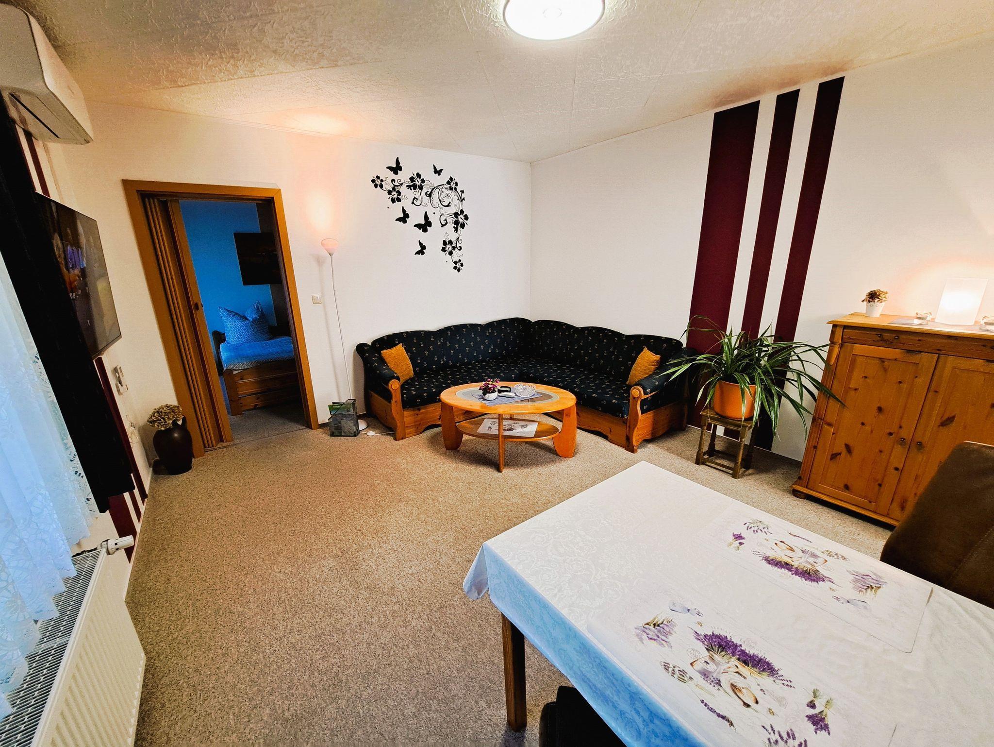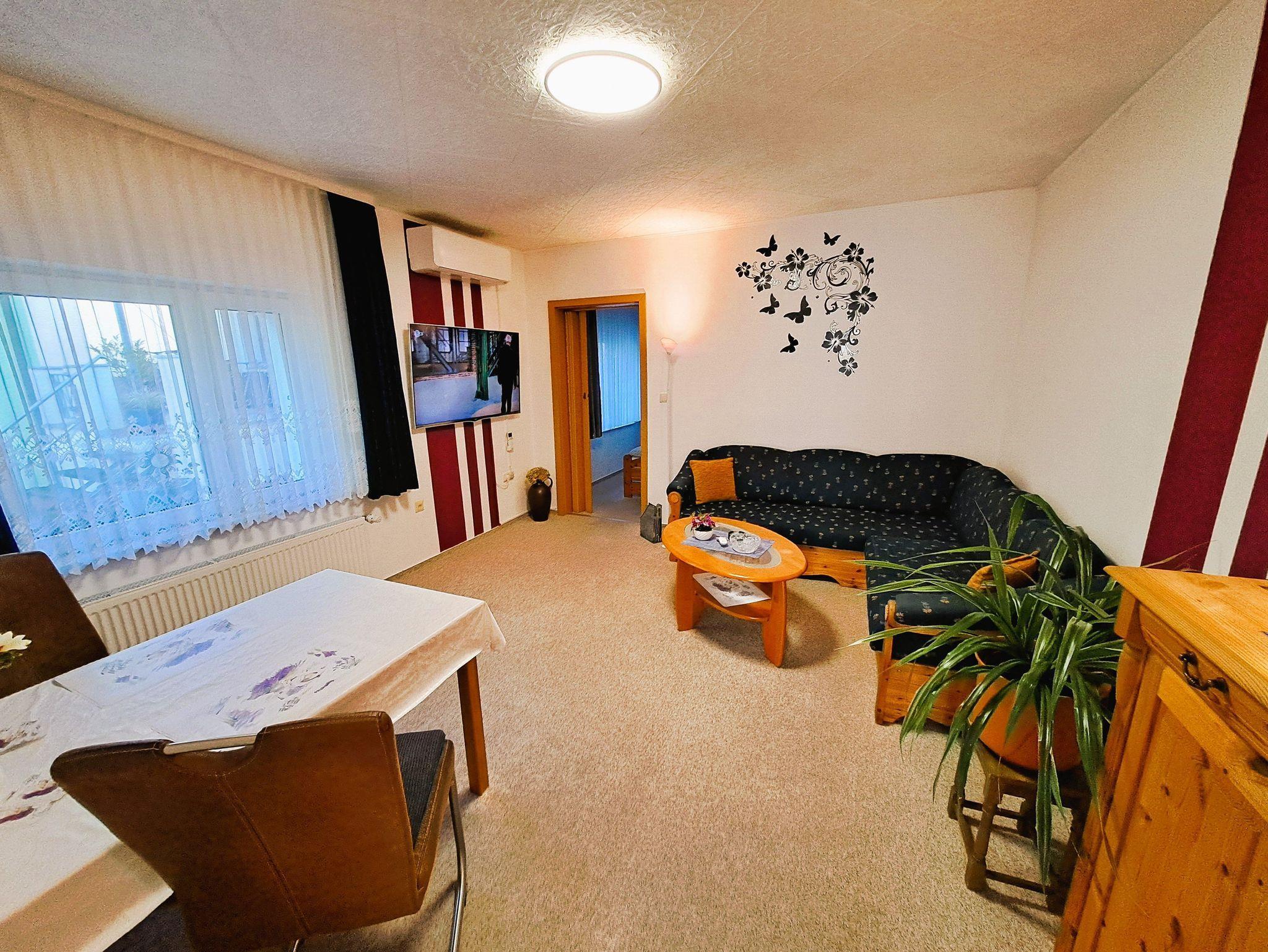 Das großzügige Wohnzimmer ist der ideale Ort zum Entspannen: Machen Sie es sich auf der gemütlichen Couchlandschaft bequem, genießen Sie Ihre Mahlzeiten am Esstisch oder lassen Sie den Abend bei einem Film auf dem TV ausklingen.