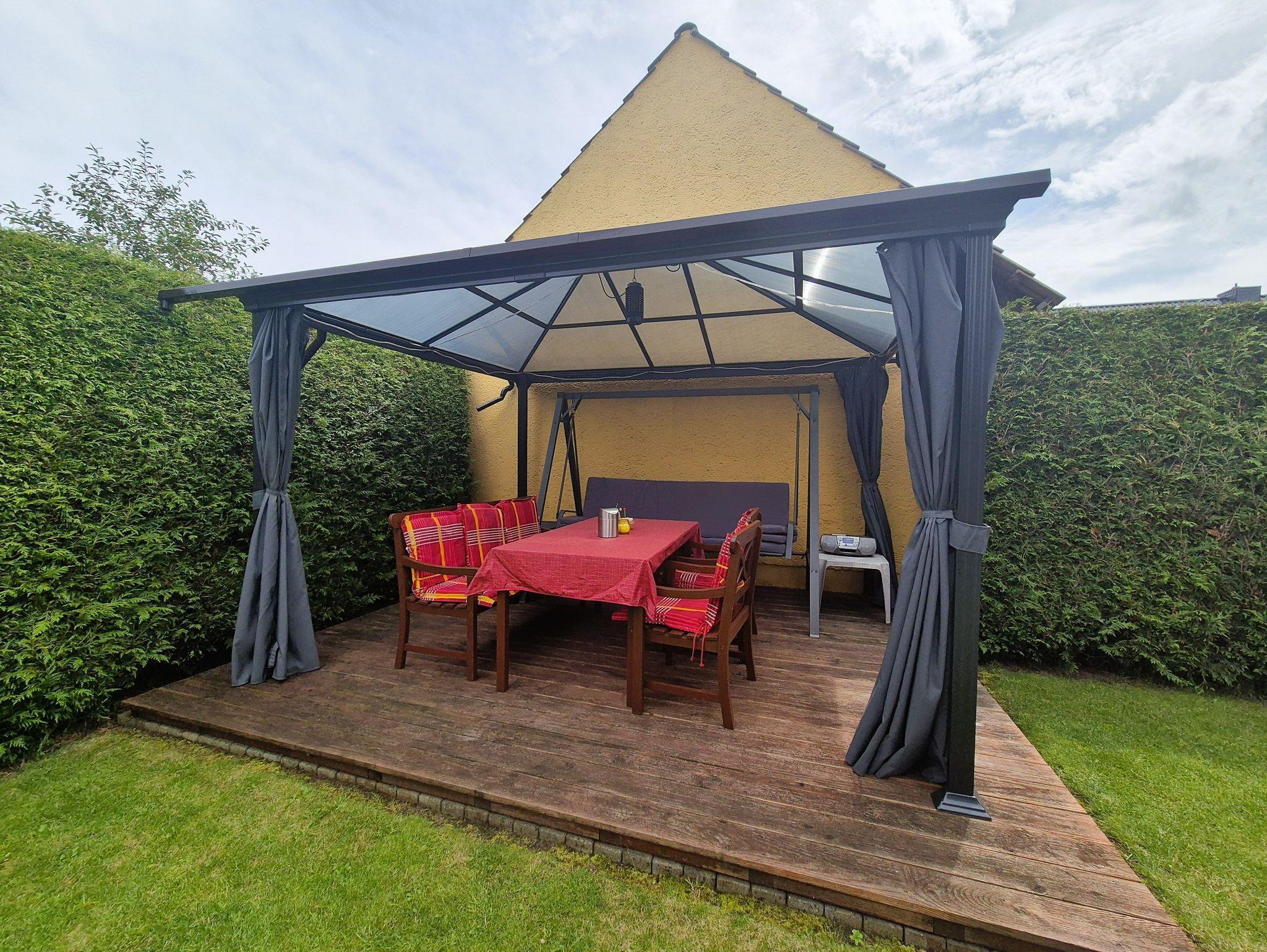 Außenanlage: verschiedene Liege- und Sitzmöglichkeiten, Grill, Tischtennisplatte und der beheizbare Swimmingpool (7,5 m x 3,5 m und 1,50 m tief) zur Mitbenutzung von Mai-September (je nach Außentemperatur).