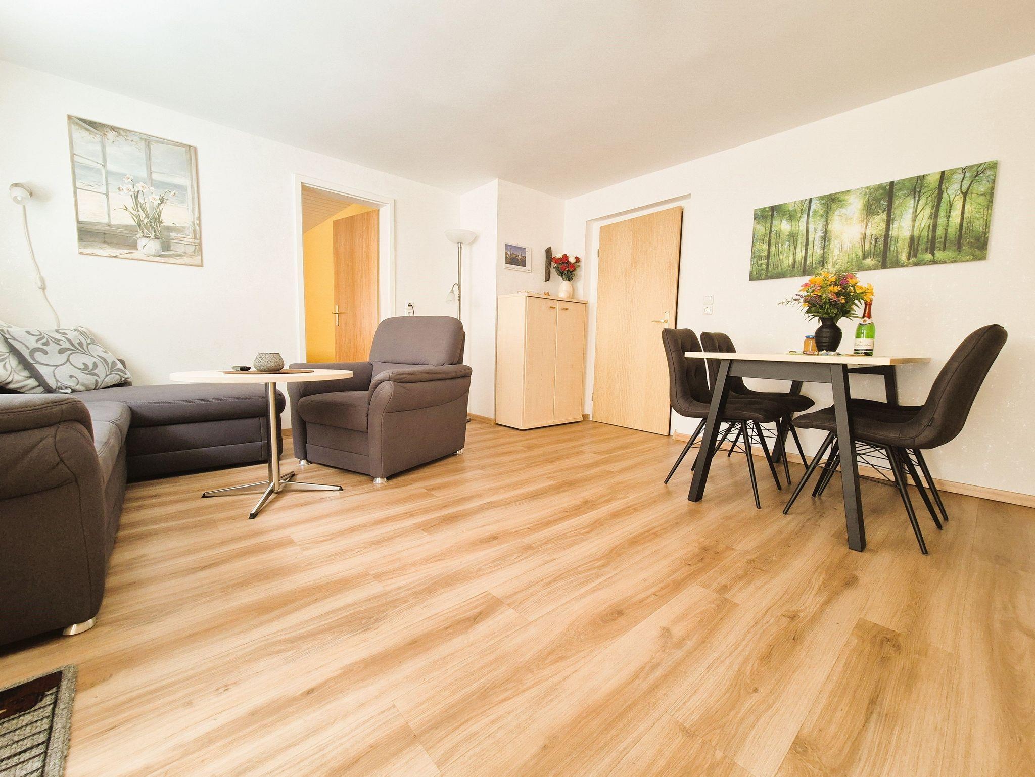 Verbringen Sie Ihren Urlaub in unserer gemütlichen Ferienwohnung im Halbsouterrainbereich, die durch große Fenster viel Licht und eine angenehme Atmosphäre bietet. Der Eingangsbereich empfängt Sie mit einem einladenden Wohnraum, der mit einer bequemen Couchlandschaft, einer Schlafcouch, einem Flachbild-TV und einem Esstisch ausgestattet ist ? ideal zum Entspannen oder für gesellige Abende.
