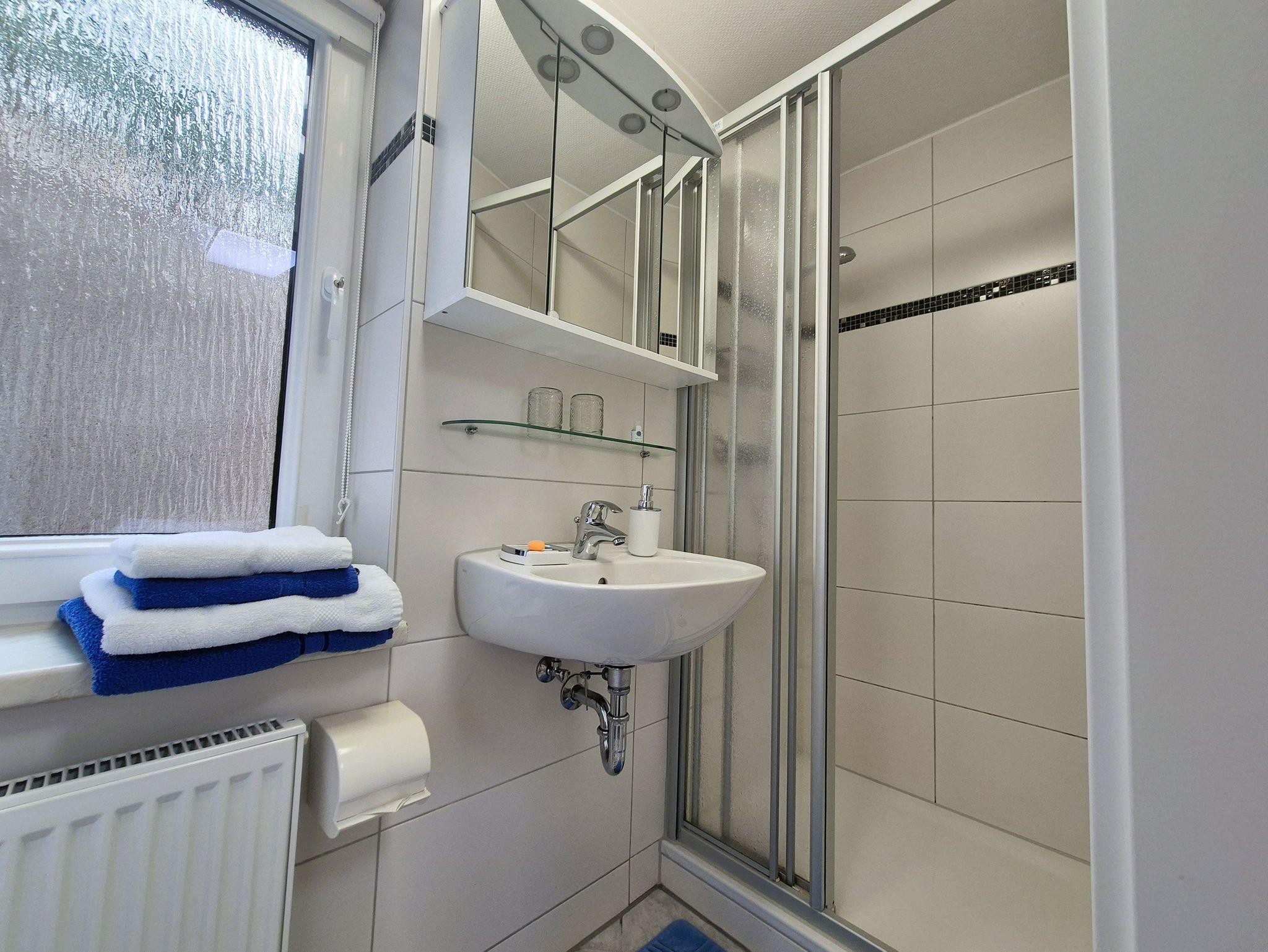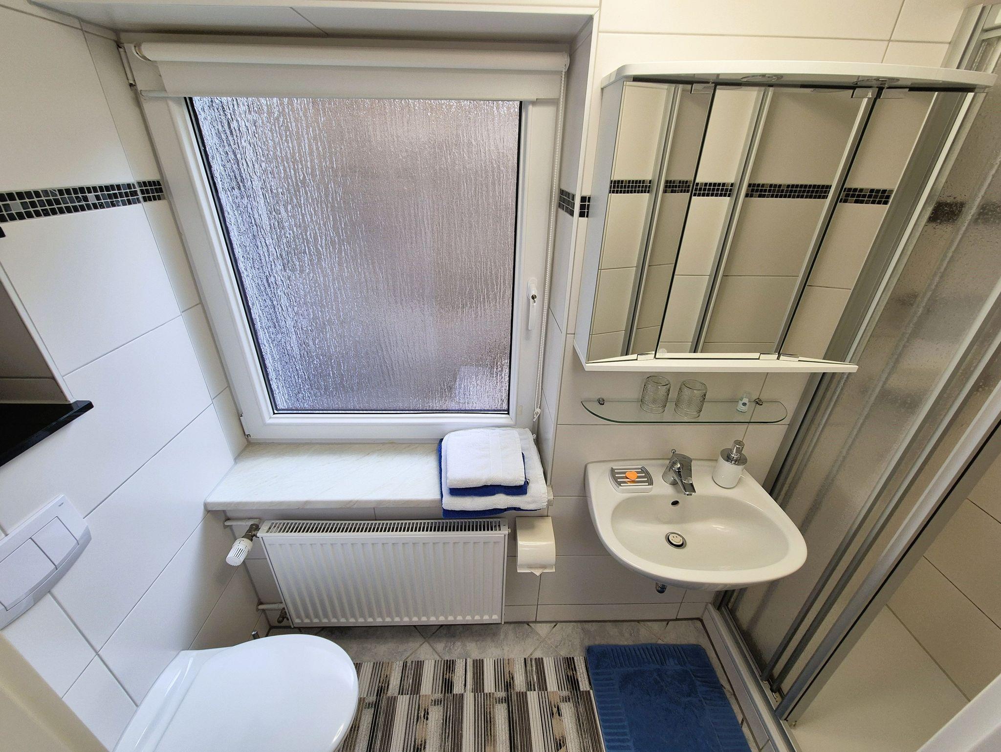 Das Badezimmer ist kompakt, aber durchdacht: Eine Dusche mit Duschwänden, ein Waschtisch, WC und ein Tageslichtfenster sorgen für einen angenehmen Start in den Tag.