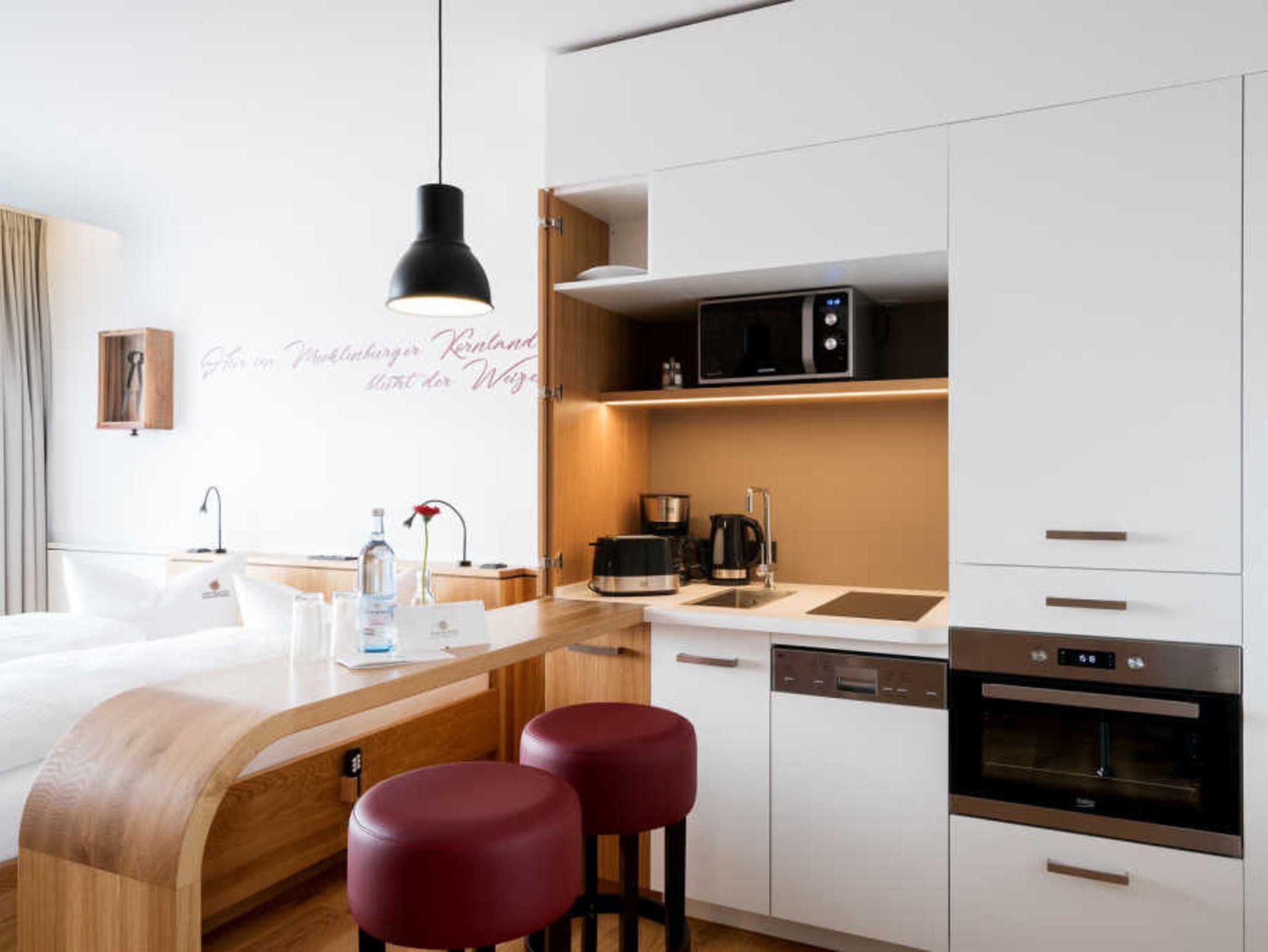 Die Suite Ziegenmarkt befindet sich im Obergeschoss des Hauses und verfügt über einen kombinierten Wohn-/Schlaf und Essbereich mit offener Küche und einen Balkon: 7 qm (Müritzblick Südseite). Extras: Doppelbett mit elektrischen Lattenrosten für mehr Komfort, Bad mit Dusche und WC, Sat-TV, Radio, Tresor, vollausgestattete Küchenzeile, Essecke, Haartrockner. Bei Anreise sind Bettwäsche und Handtücher sowie eine Flasche Wasser zur Begrüßung vorhanden.