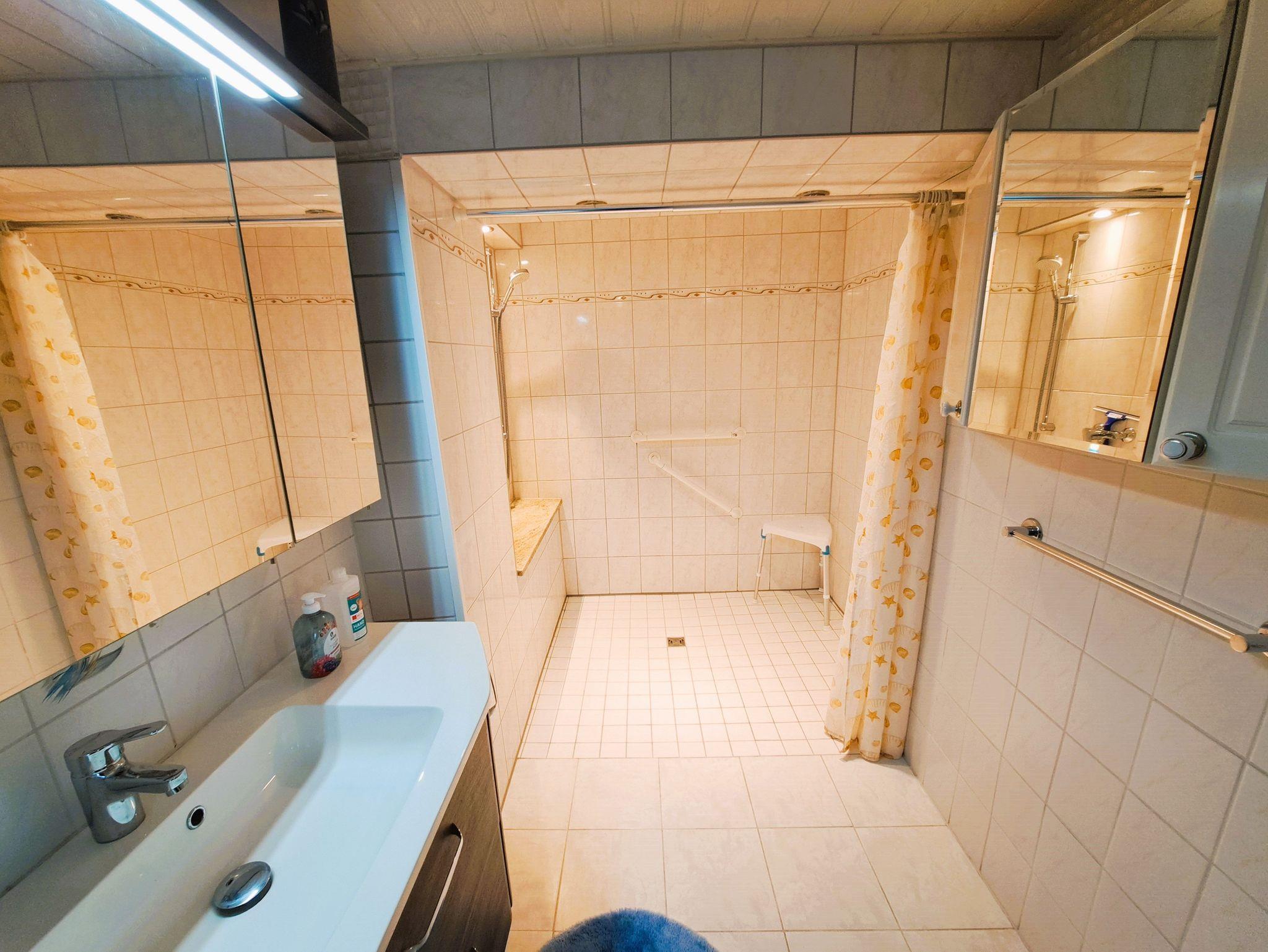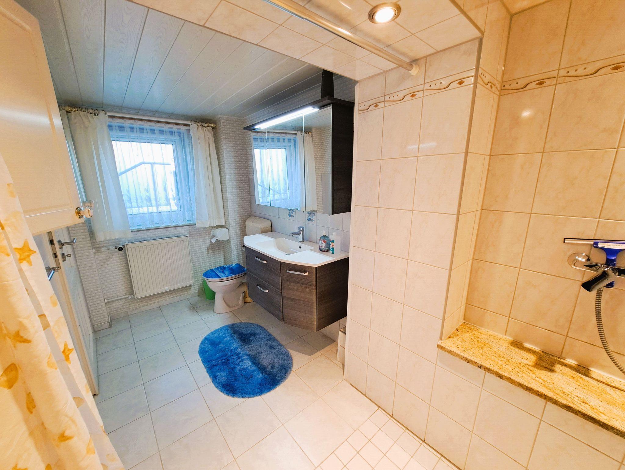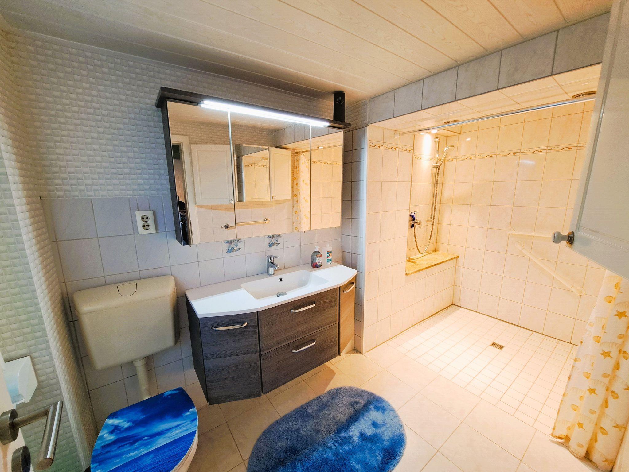 Im Tageslichtbad erwartet Sie eine großzügige, ebenerdige Dusche mit Duschvorhang, ein Waschtisch und ein WC, so kann der Tag beginnen. Das gemütliche Wohnzimmer lädt zum Entspannen ein und bietet eine ausziehbare Couchlandschaft, Platz für ein Zustellbett sowie einen Flachbild-TV für Ihre Unterhaltung.