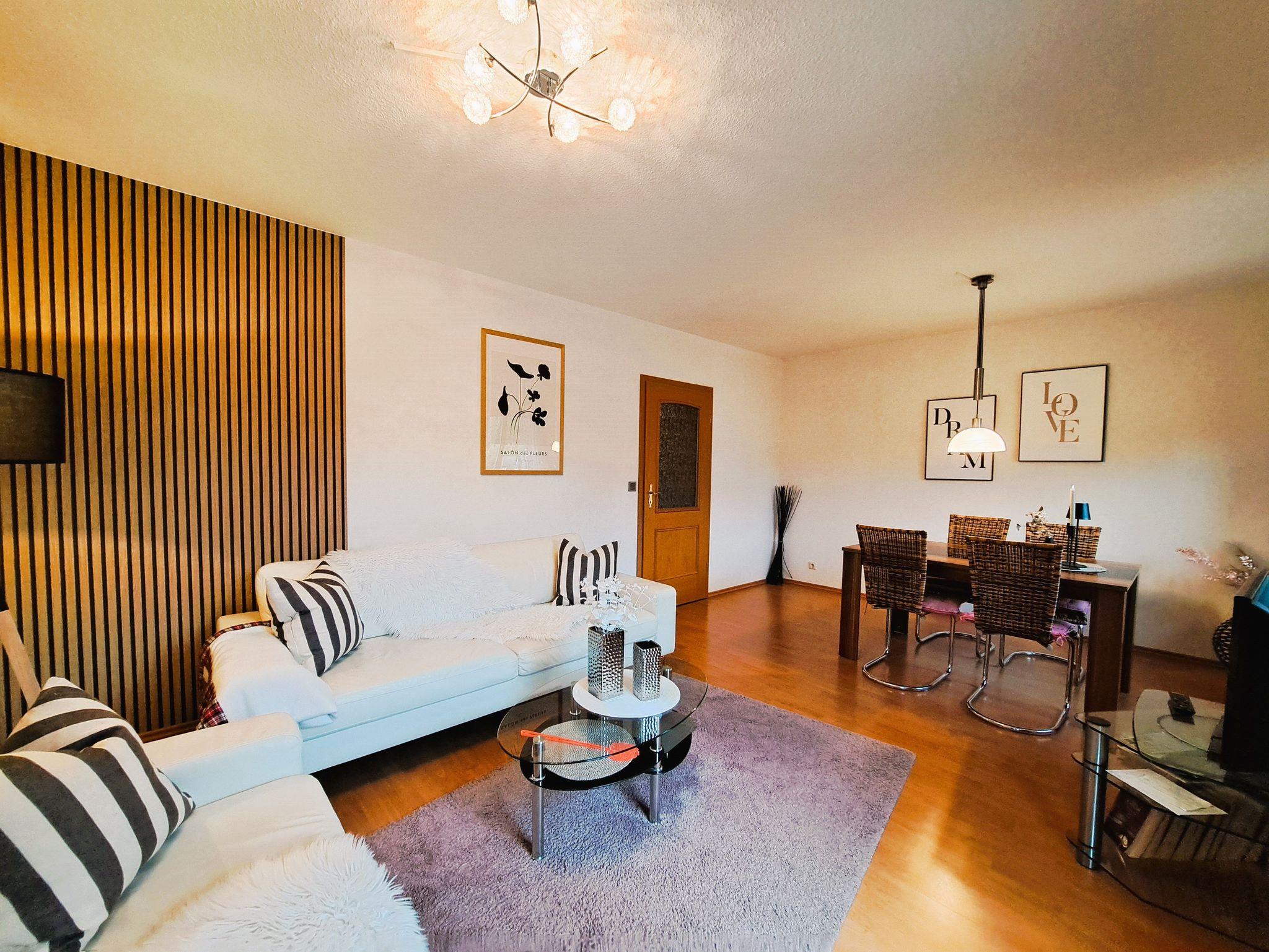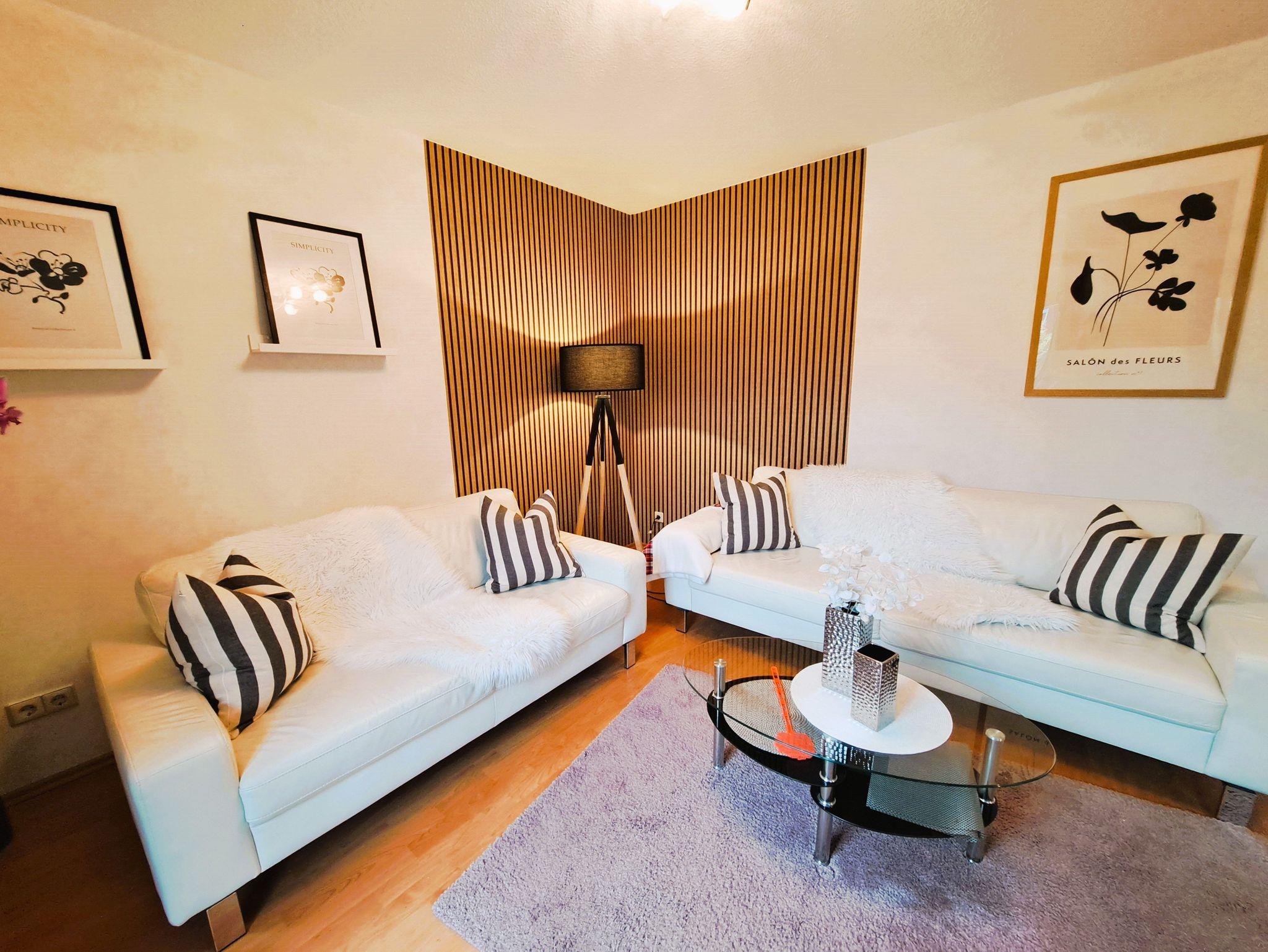 Am Ende des Flures öffnet sich das Herzstück der Wohnung: das einladende Wohnzimmer. Hier laden eine große, bequeme Couchlandschaft und der Esstisch für bis zu vier Personen zum Verweilen ein. Ob gemeinsames Essen, ein geselliger Spieleabend oder gemütliches Fernsehen ? dank Flachbild-TV und Gesellschaftsspielen kommt keine Langeweile auf.