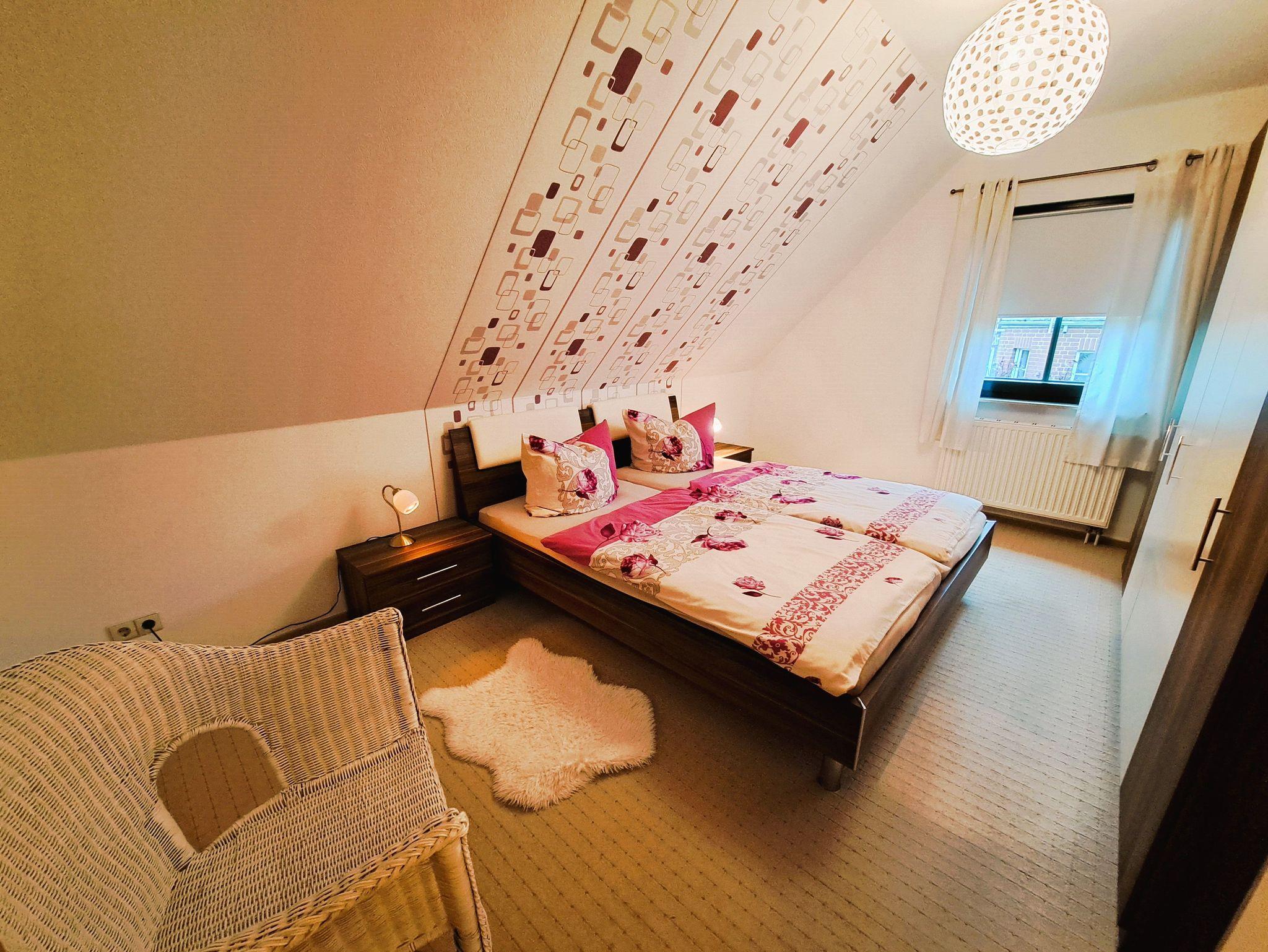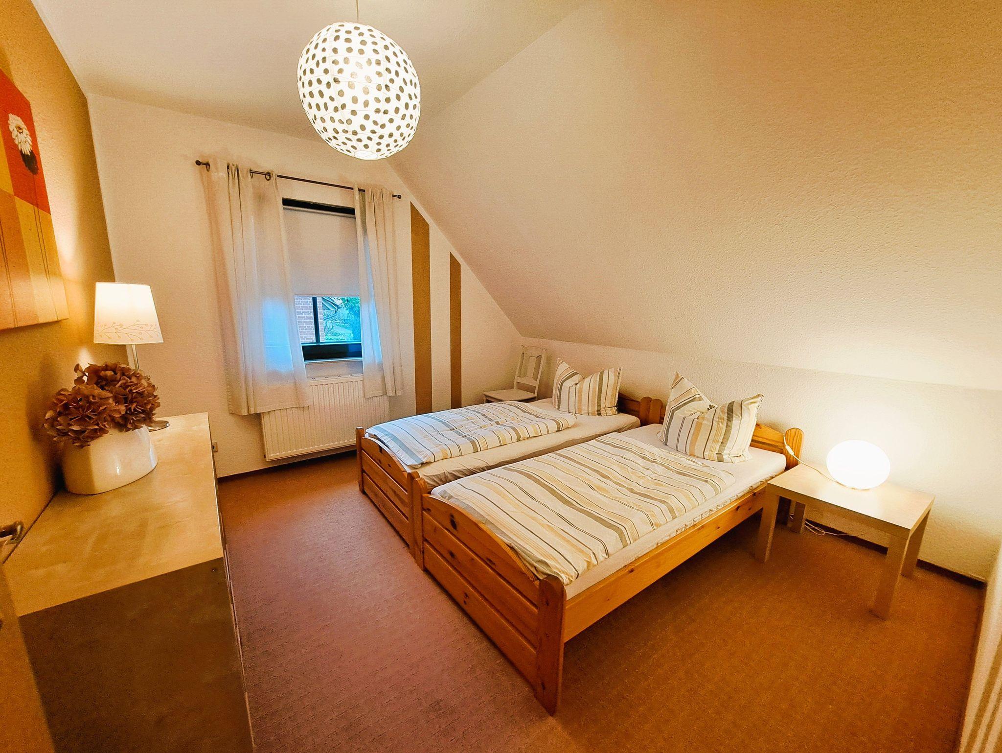 Nun führt Sie eine Treppe hinauf in das Obergeschoss der Wohnung. Dort erwarten Sie zwei liebevoll eingerichtete Schlafzimmer, die mit zusammenstehenden Einzelbetten, einem Kleiderschrank und Nachttischen ? ideal für erholsame Nächte und entspannte Urlaubstage. Zusätzlich steht Ihnen auf dieser Etage ein Gäste-WC zur Verfügung.