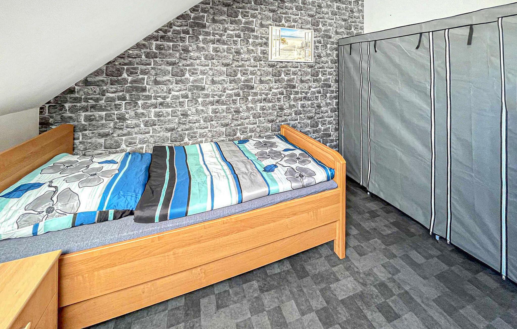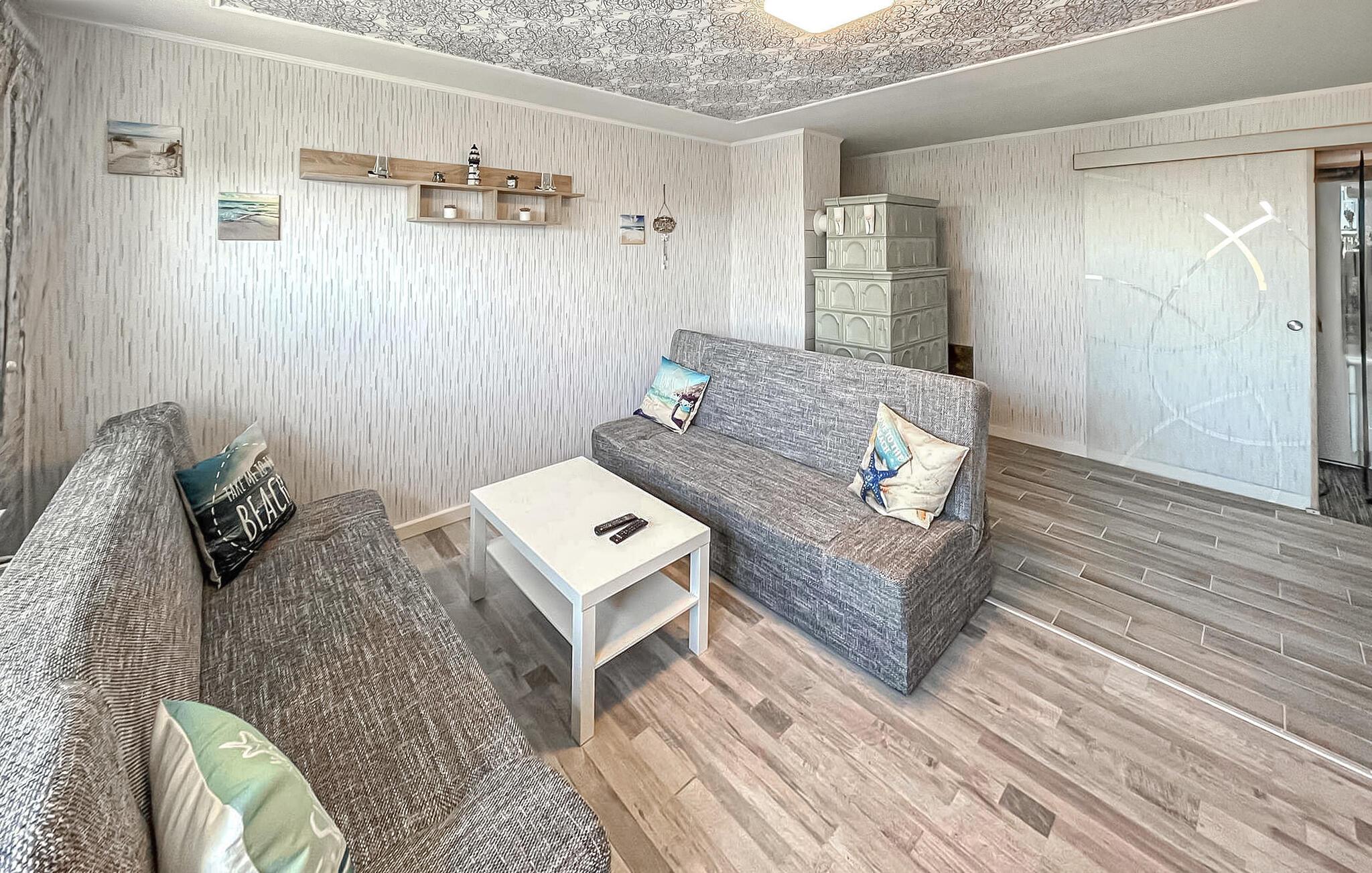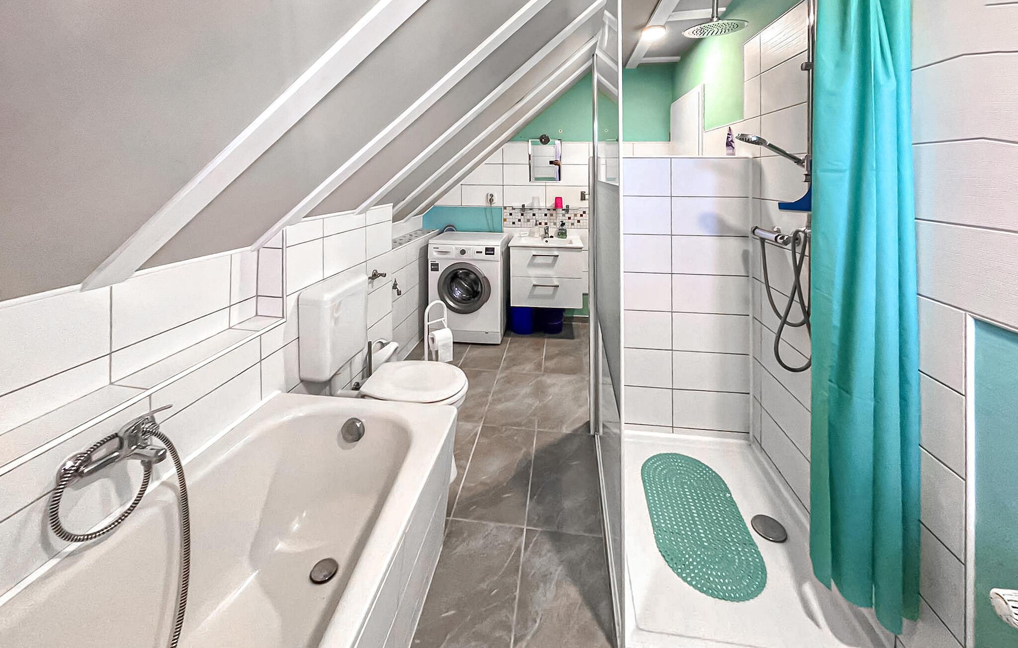 Den 87 m² store ferieleiligheten for maksimalt 7 personer og et lite barn ligger i hele øverste etasje i vertens hus på en 600 m² stor boligeiendom i Waren-bydelen Jägerhof. Kurbyen Waren ligger ca. 5 km unna, og ferieleiligheten ble omfattende modernisert og delvis nyinnredet i 2022. Den har egen inngang og er utstyrt med stue (stoppede møbler med sovefunksjon som ekstraseng for 2 personer, flatskjerm-TV, stereoanlegg, kakkelovn), separat kjøkken (elektrisk komfyr med stekeovn, kjøleskap med fryser, spisebord, oppvaskmaskin, mikrobølgeovn, diverse kjøkkenutstyr), 3 soverom (1 x dobbeltseng, 1 x 2 enkeltsenger, 1 x 1 enkeltseng) og bad med dusj, badekar og vaskemaskin. En barneseng og barnestol er tilgjengelig for små barn. Internett (W-LAN) er også tilgjengelig. Oppvarming skjer via sentralvarme og kakkelovnen i stuen (ved tilgjengelig). Utenfor er det en overbygd uteservering med hagemøbler, grill, sikker oppbevaring for sykler, et lite basseng og 2 parkeringsplasser.