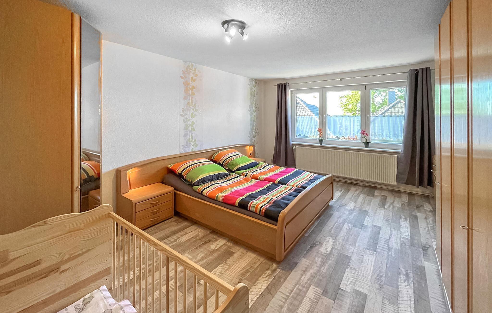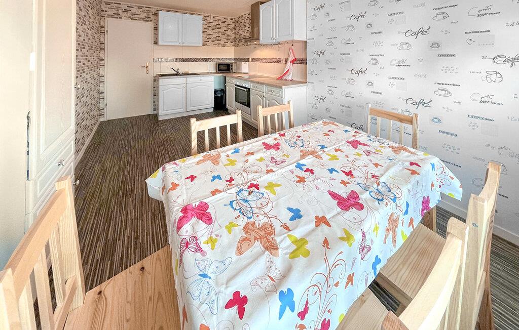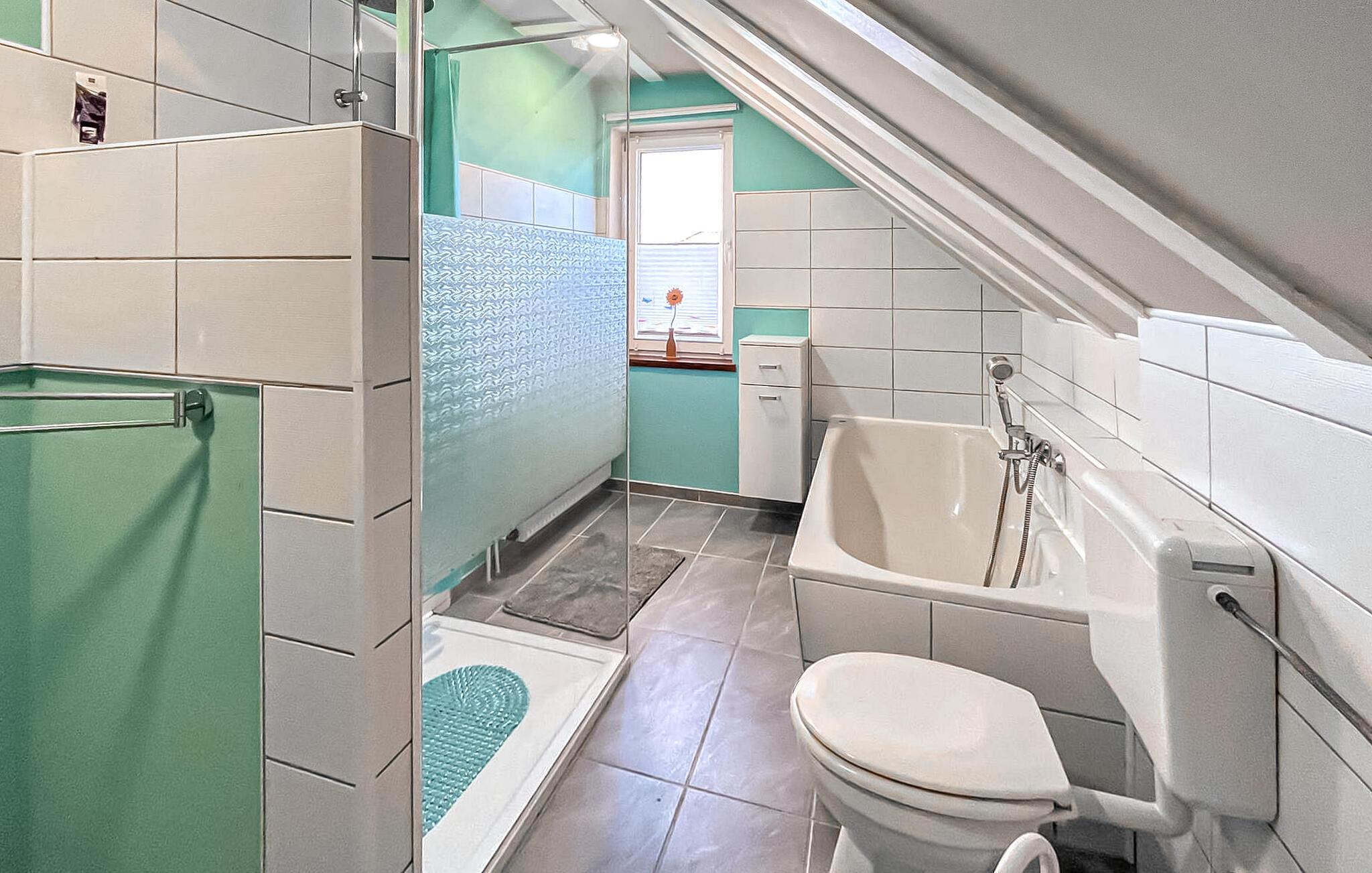 Den 87 m² store ferieleiligheten for maksimalt 7 personer og et lite barn ligger i hele øverste etasje i vertens hus på en 600 m² stor boligeiendom i Waren-bydelen Jägerhof. Kurbyen Waren ligger ca. 5 km unna, og ferieleiligheten ble omfattende modernisert og delvis nyinnredet i 2022. Den har egen inngang og er utstyrt med stue (stoppede møbler med sovefunksjon som ekstraseng for 2 personer, flatskjerm-TV, stereoanlegg, kakkelovn), separat kjøkken (elektrisk komfyr med stekeovn, kjøleskap med fryser, spisebord, oppvaskmaskin, mikrobølgeovn, diverse kjøkkenutstyr), 3 soverom (1 x dobbeltseng, 1 x 2 enkeltsenger, 1 x 1 enkeltseng) og bad med dusj, badekar og vaskemaskin. En barneseng og barnestol er tilgjengelig for små barn. Internett (W-LAN) er også tilgjengelig. Oppvarming skjer via sentralvarme og kakkelovnen i stuen (ved tilgjengelig). Utenfor er det en overbygd uteservering med hagemøbler, grill, sikker oppbevaring for sykler, et lite basseng og 2 parkeringsplasser.
