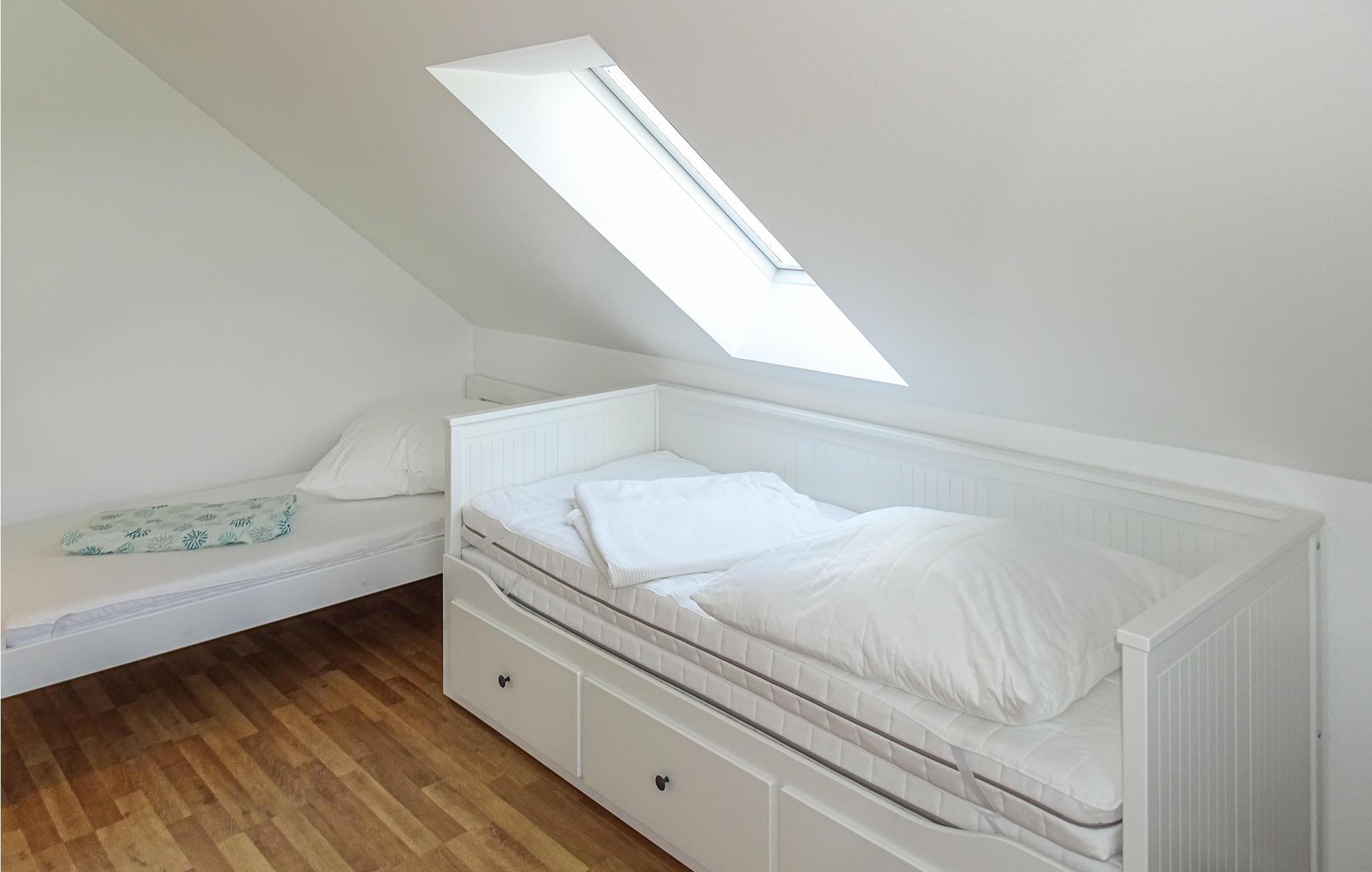 Ferieleiligheten ligger i husets øverste etasje. Stuen med åpent kjøkken er komfortabelt innredet. Det er to separate soverom. Det første er innredet med en dobbeltseng, det andre soverommet har to enkeltsenger og en uttrekkbar dagseng. Fra stuen har du tilgang til den romslige balkongen med utsikt over innsjøen. Nyt frokosten sammen her om morgenen.