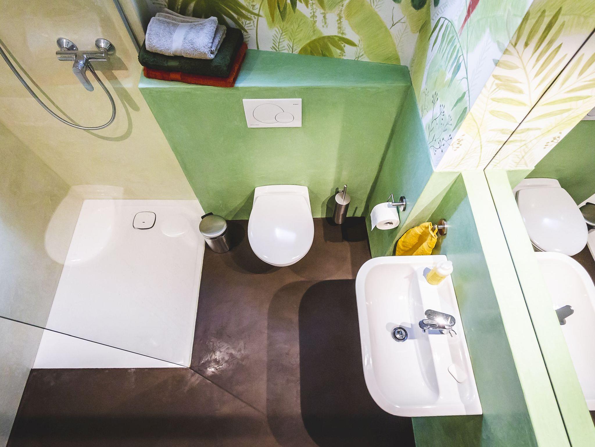Genießen Sie Ihre Dusche im Dschungelbad, gestaltet von regionalen Handwerkerinnen in traditionsreicher Tadelakt-Technik (marokkanischer Glanzputz).