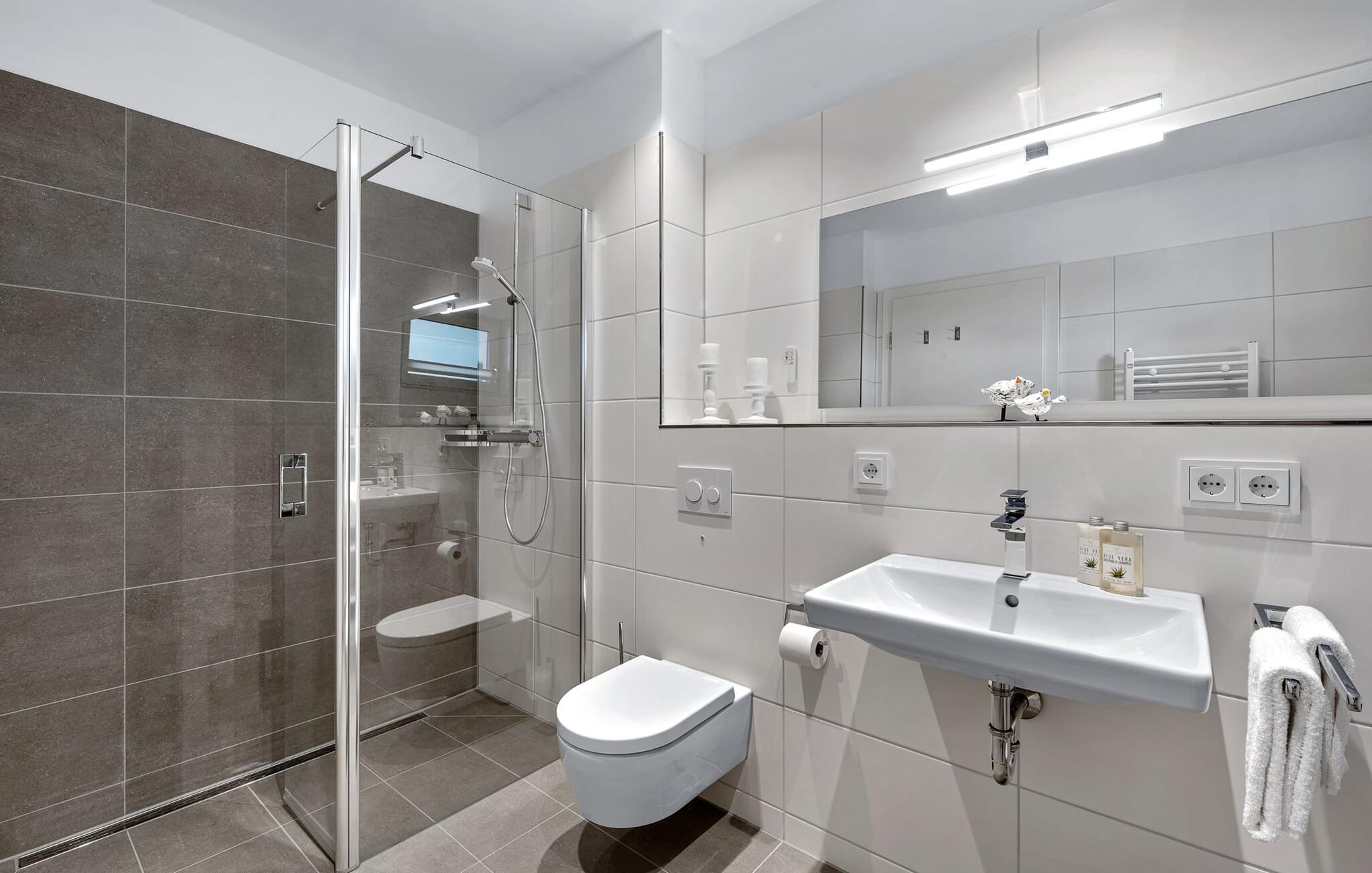 Badet med dusjen på gulvnivå er også utstyrt med alt annet du trenger for en god start på en ny feriedag.