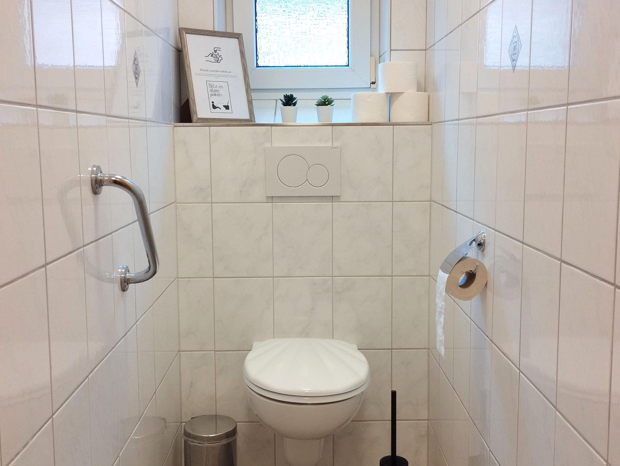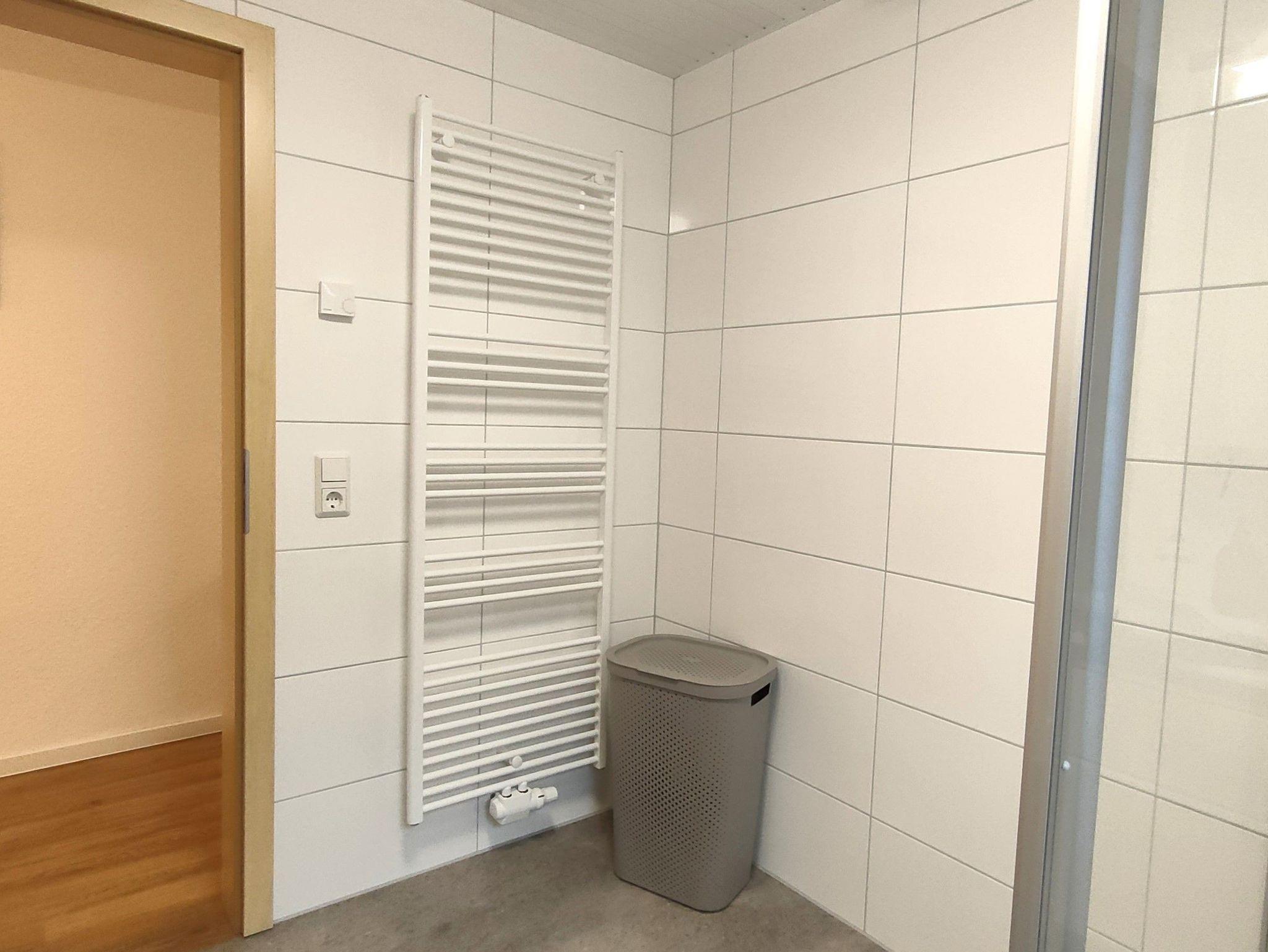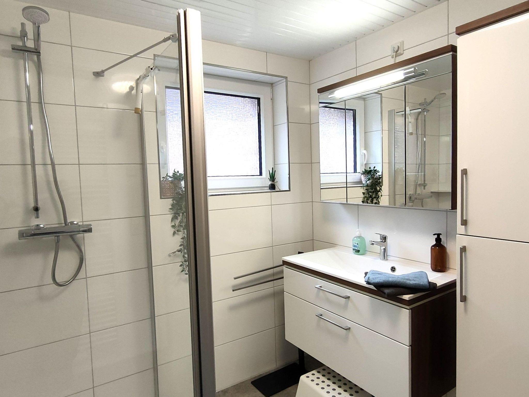 Im Bad befinden sich die Dusche und Waschbecken. Die Toilette ist separat.