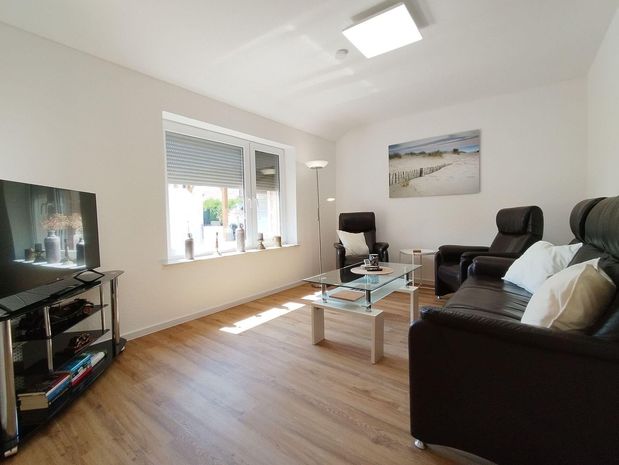 Wohnzimmer mit Sitzecke und Fernseher. Die Wohnung ist mit einer Fußbodenheizung ausgestattet (Flur und Schlafzimmer zwei sind mit Heizkörpern ausgestattet.)