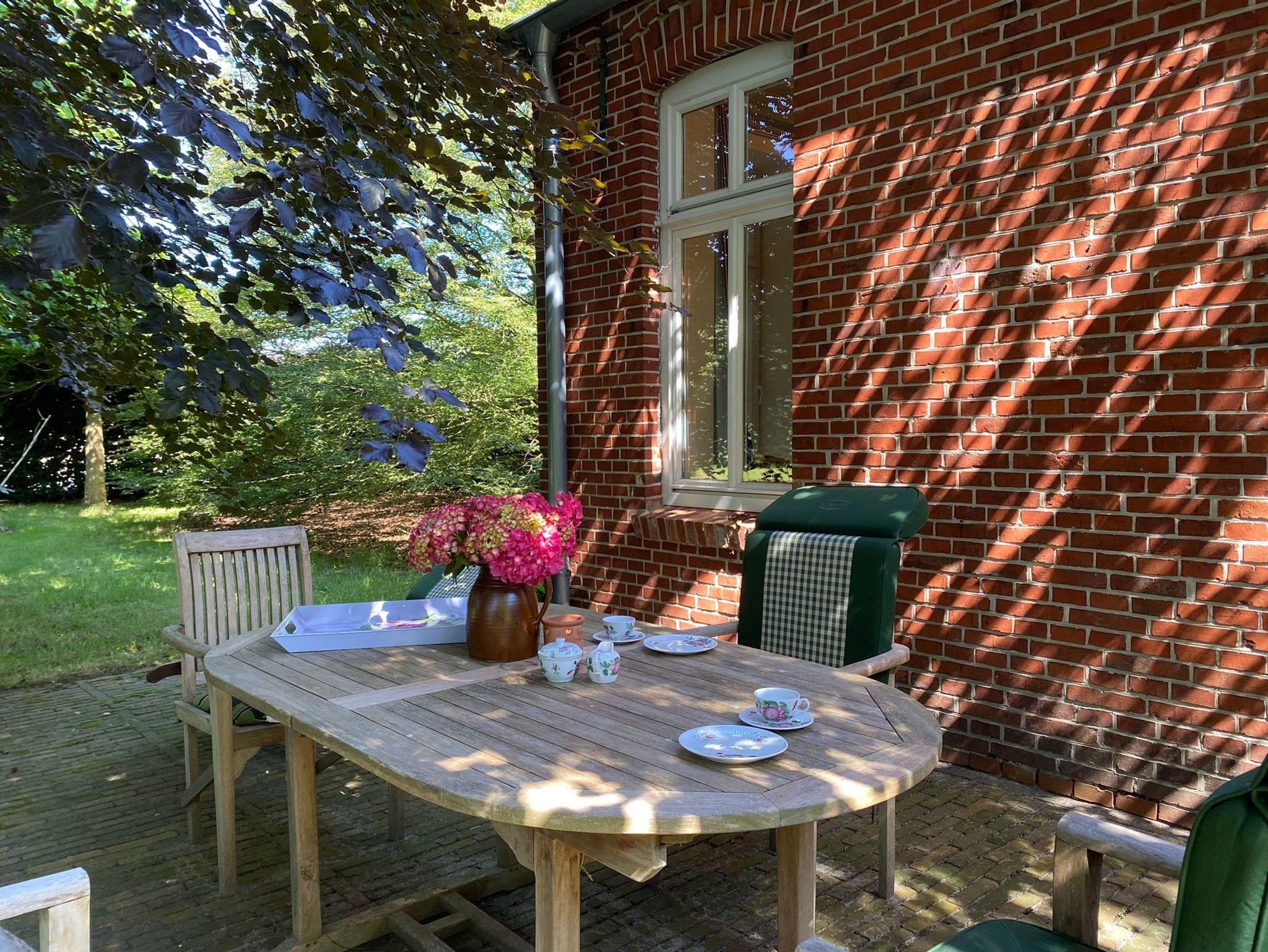 Die große Terrasse unter alten Bäumen und das weitläufige Grundstück laden zum Aufenthalt im Freien ein.