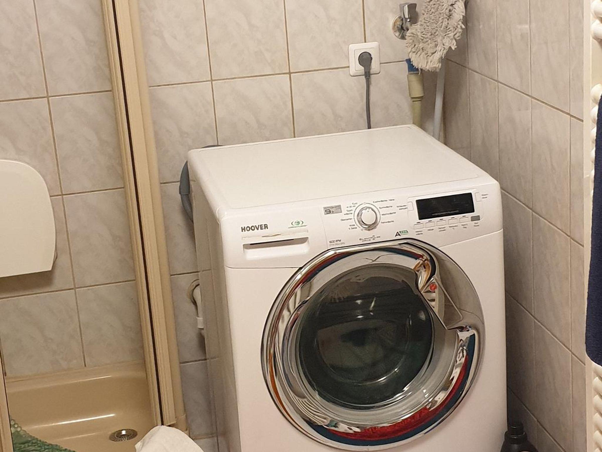 Bad mit Duschkabine, WC, Spiegelschrank, Personenwaage, Waschbecken und Waschmaschine.
