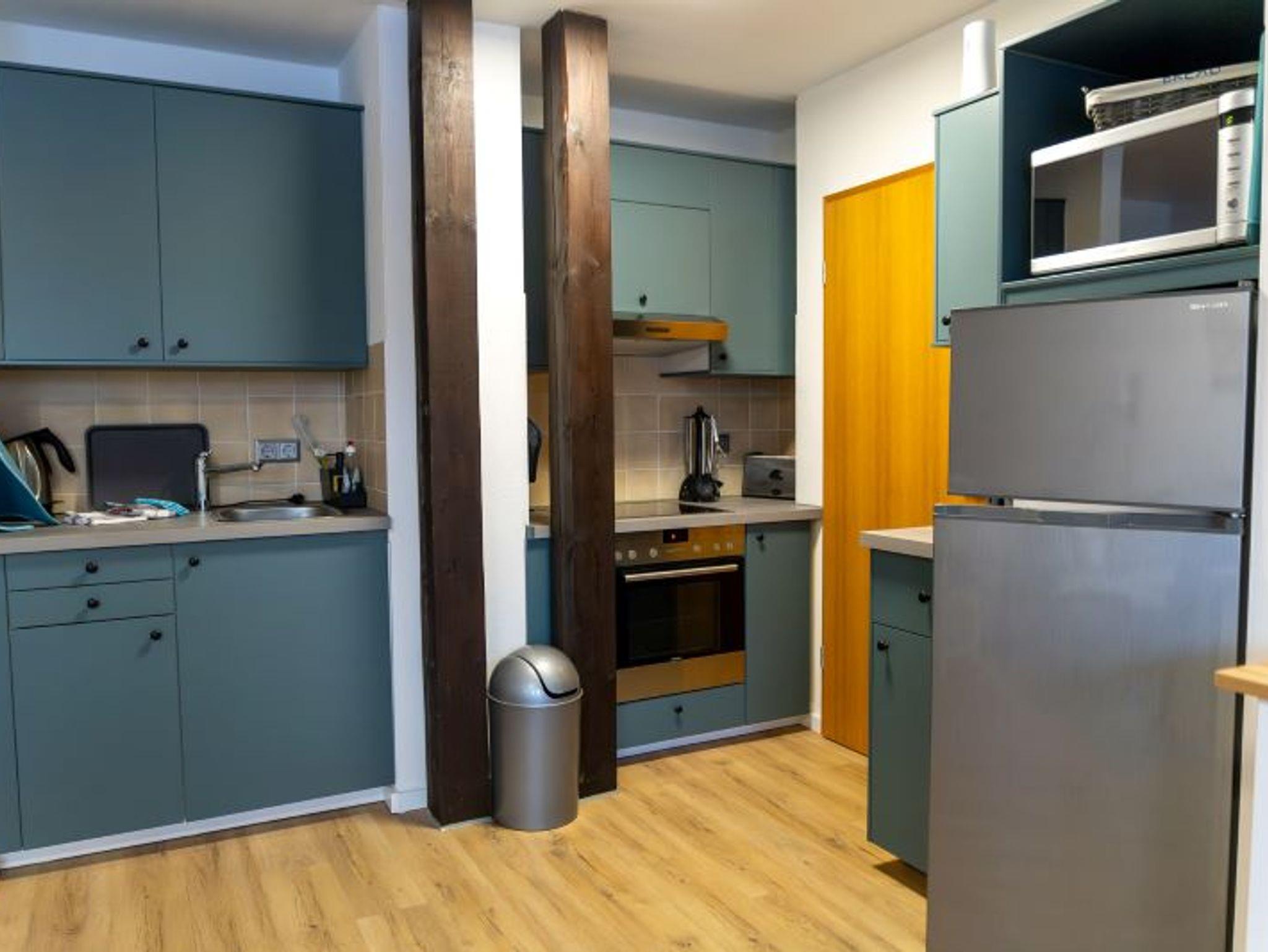 Die Einbauküche bietet unter anderem einen Kühlschrank mit Gefrierfach, eine Spülmaschine, eine Kaffeemaschine, einen Toaster, einen Wasserkocher sowie ausreichend Geschirr, Töpfe und Gläser.