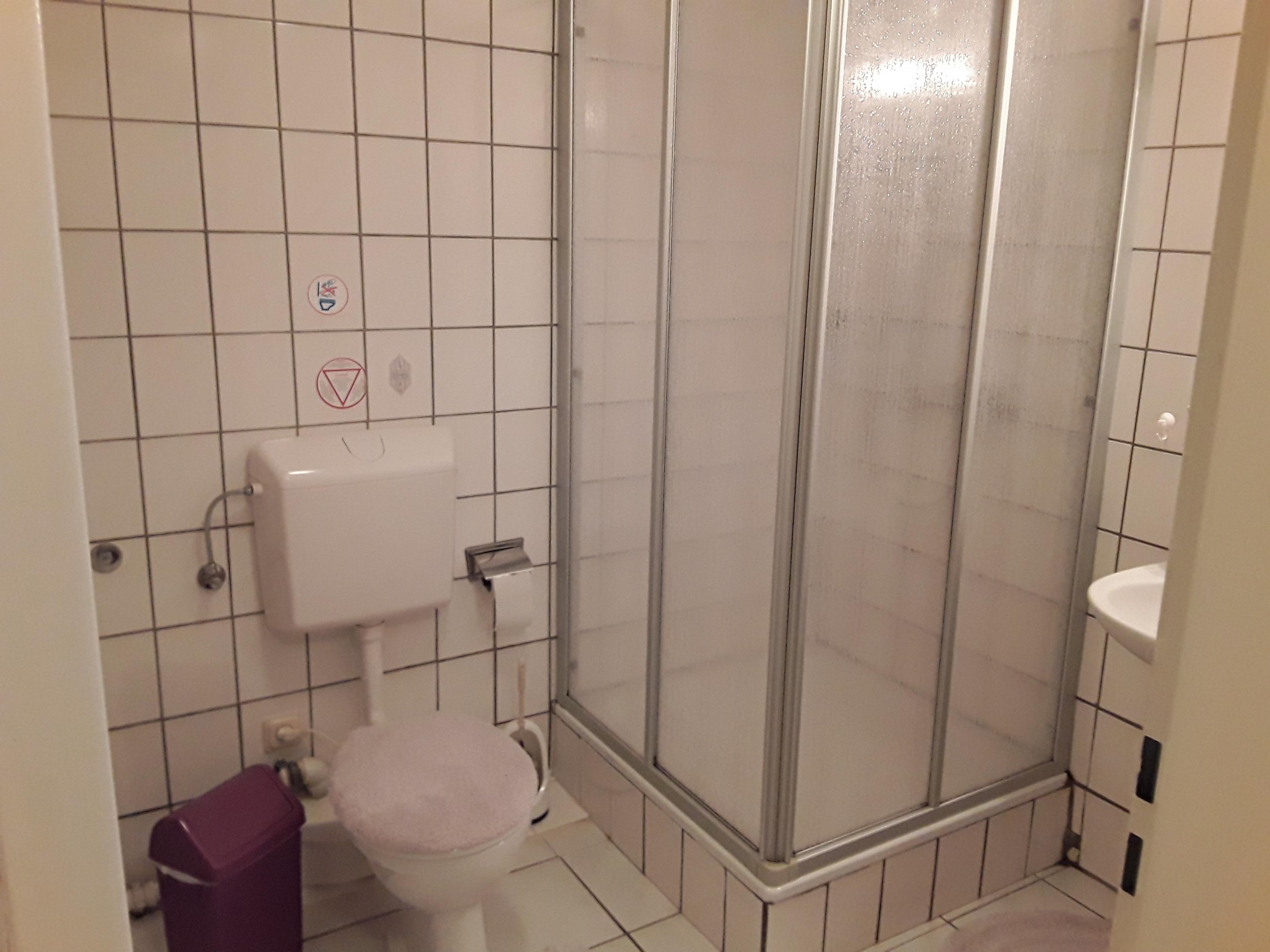 Voll gefliestes Badezimmer mit Dusche, Waschbecken und WC.