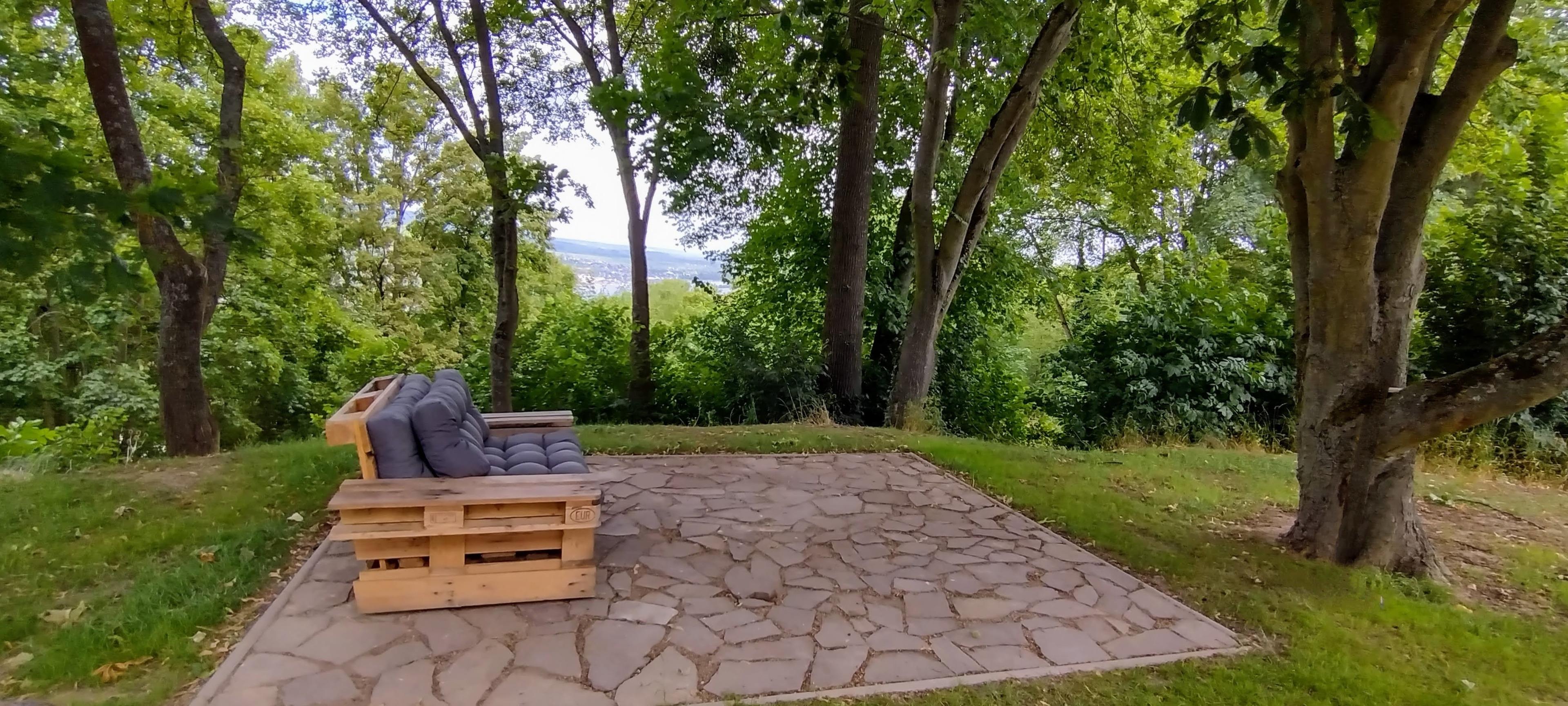 Ein eigener Terrassenbereich oder die gemeinsame Sitzgruppe im Garten unter Bäumen mit Blick auf den Rhein wartet auf Sie.