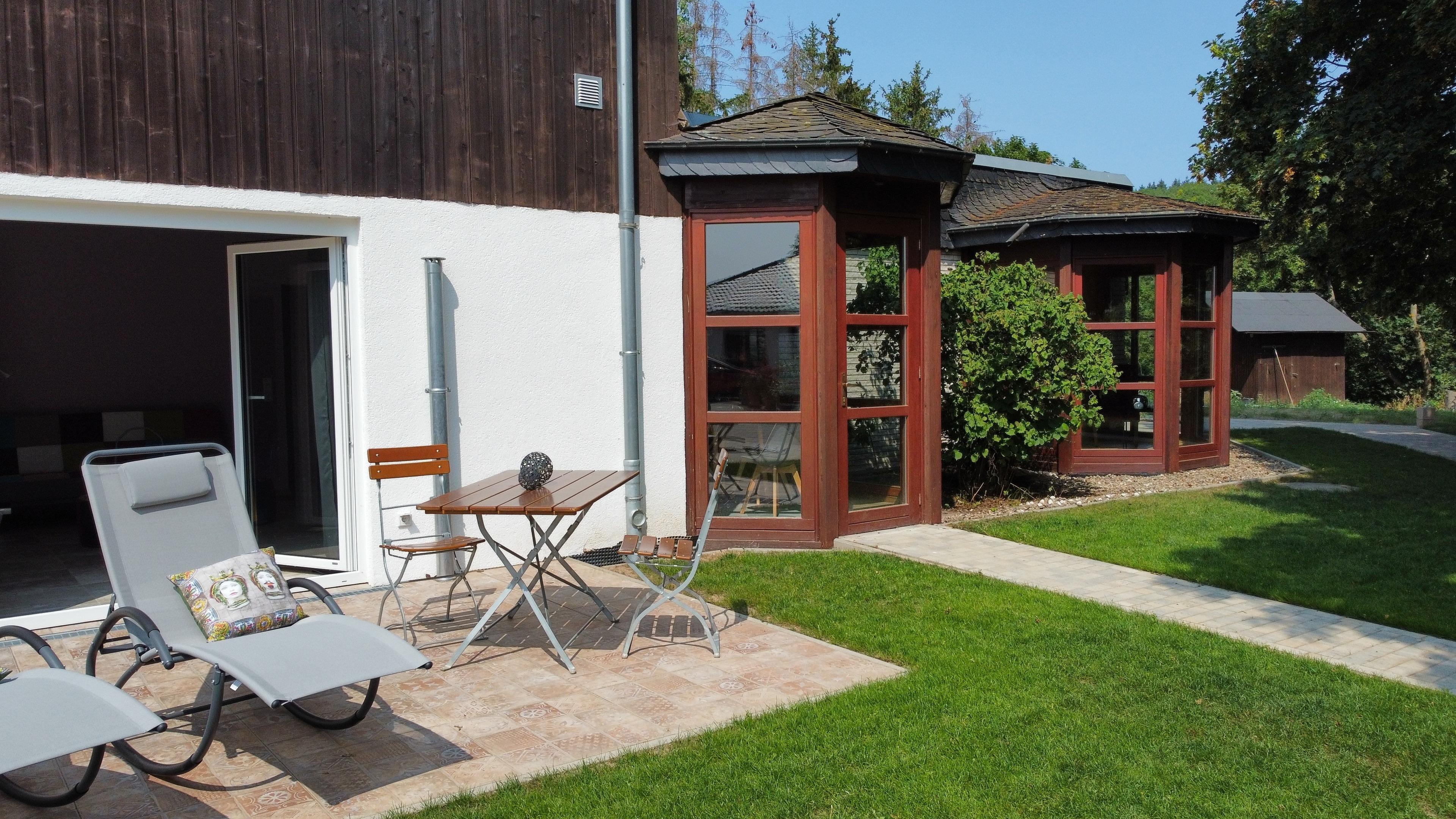Ein eigener Terrassenbereich oder die gemeinsame Sitzgruppe im Garten unter Bäumen mit Blick auf den Rhein wartet auf Sie.
