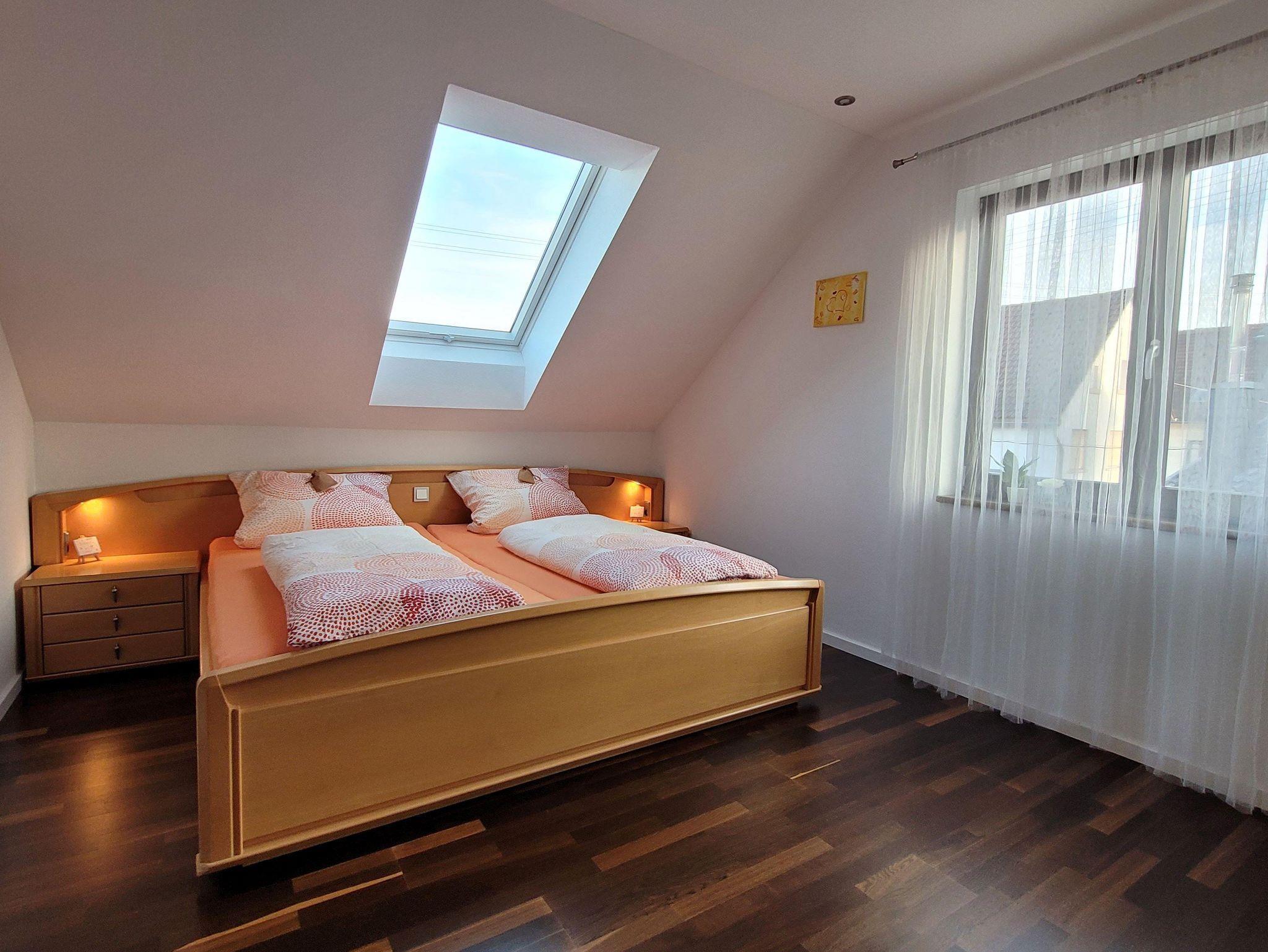 Dieses helle und geräumige Schlafzimmer beinhaltet ein Kingsize-Bett (200x200cm), einen geräumigen Kleiderschrank und Platz für ein Babyreisebett.