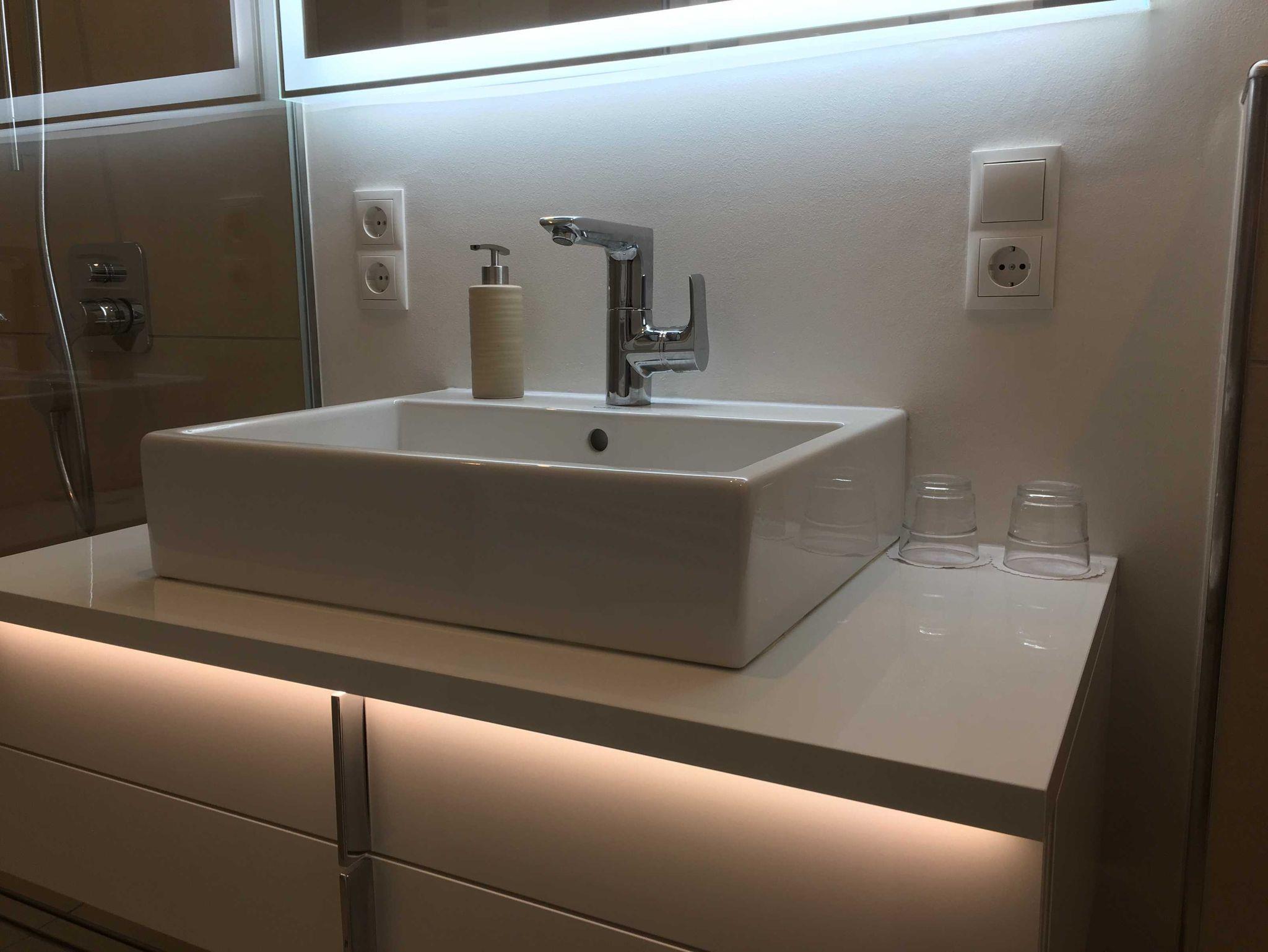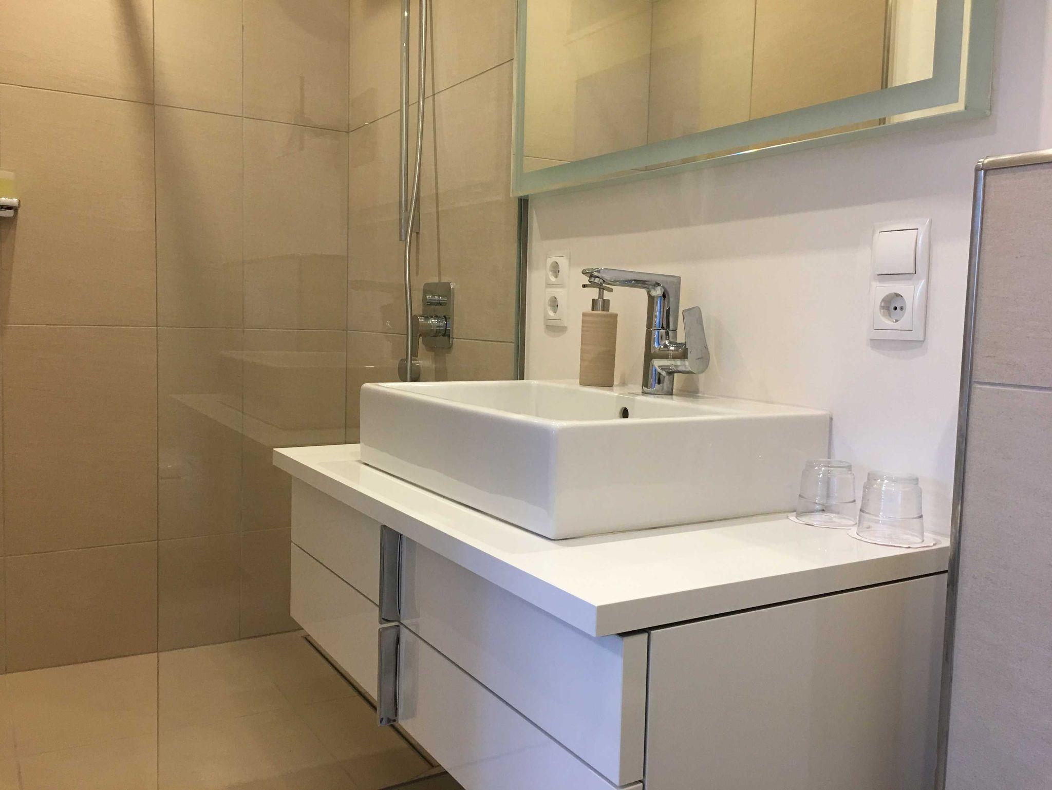 • modernes Duschbad mit hochwertigem Kosmetikspiegel, Handtüchern und Fön