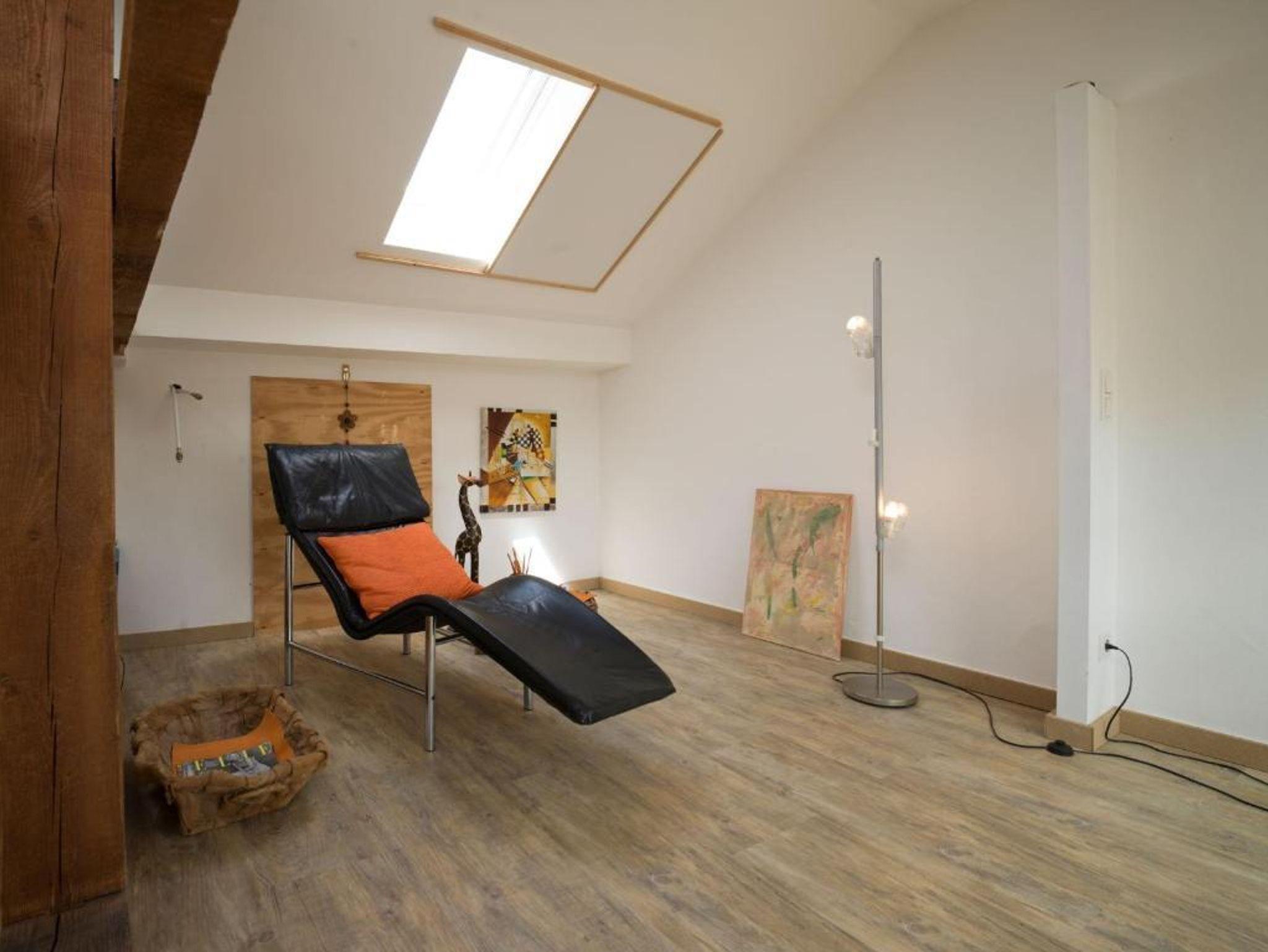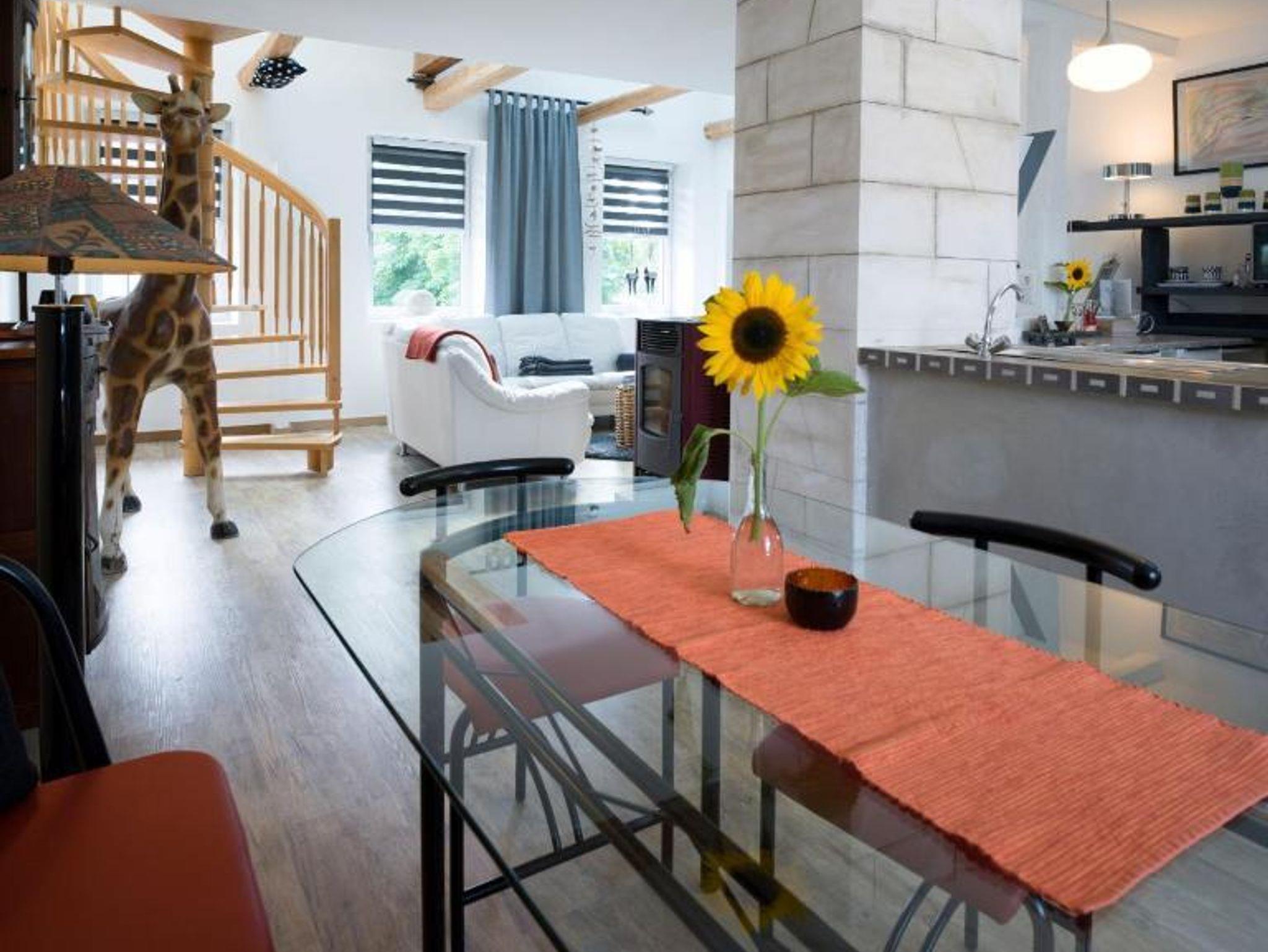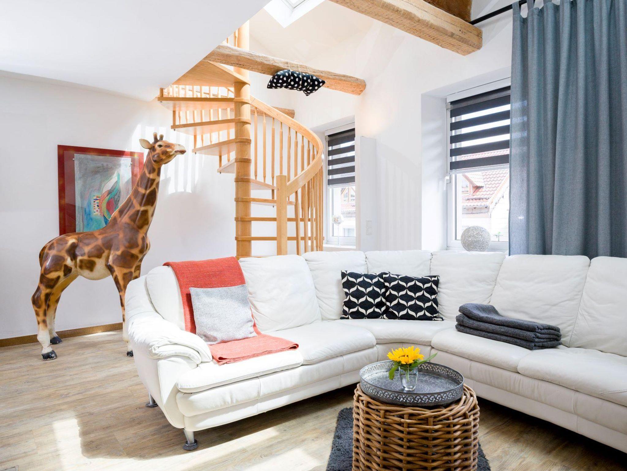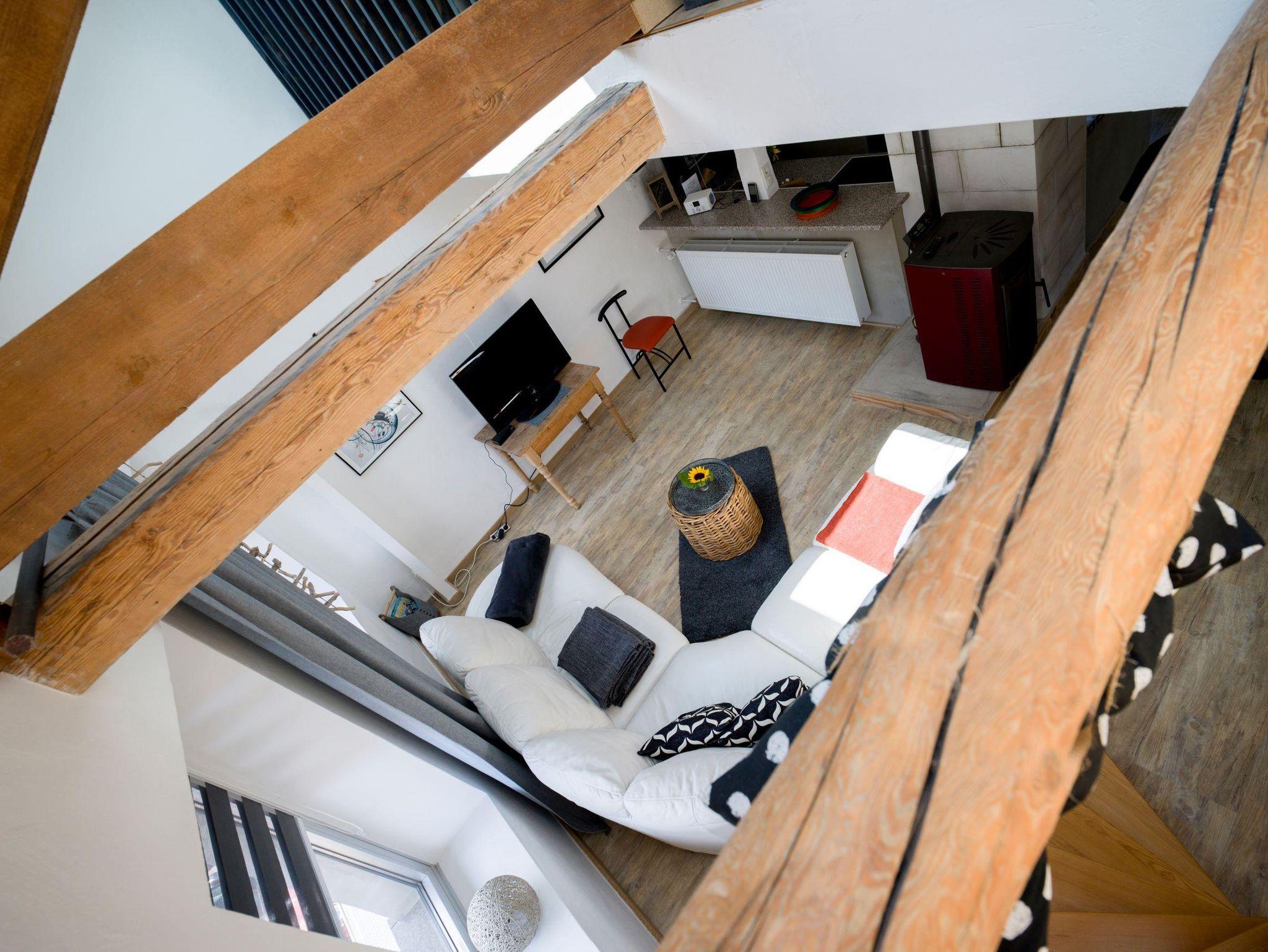 Erleben Sie modernen Wohnkomfort in einem lichtdurchfluteten, offenen Wohnbereich mit stilvoller Betonoptik. Der großzügige Wohnraum mit Galerie schafft eine einladende Atmosphäre zum Entspannen. Hochwertige Ausstattung wie Satellitenfernsehen, WLAN, ein gemütliches Wohnzimmer und eine voll ausgestattete Küche mit Elektroherd, Backofen, Kaffeemaschine und Geschirrspüler machen Ihren Aufenthalt perfekt. Die moderne Möblierung und der Holz- oder Parkettboden runden das Ambiente ab.