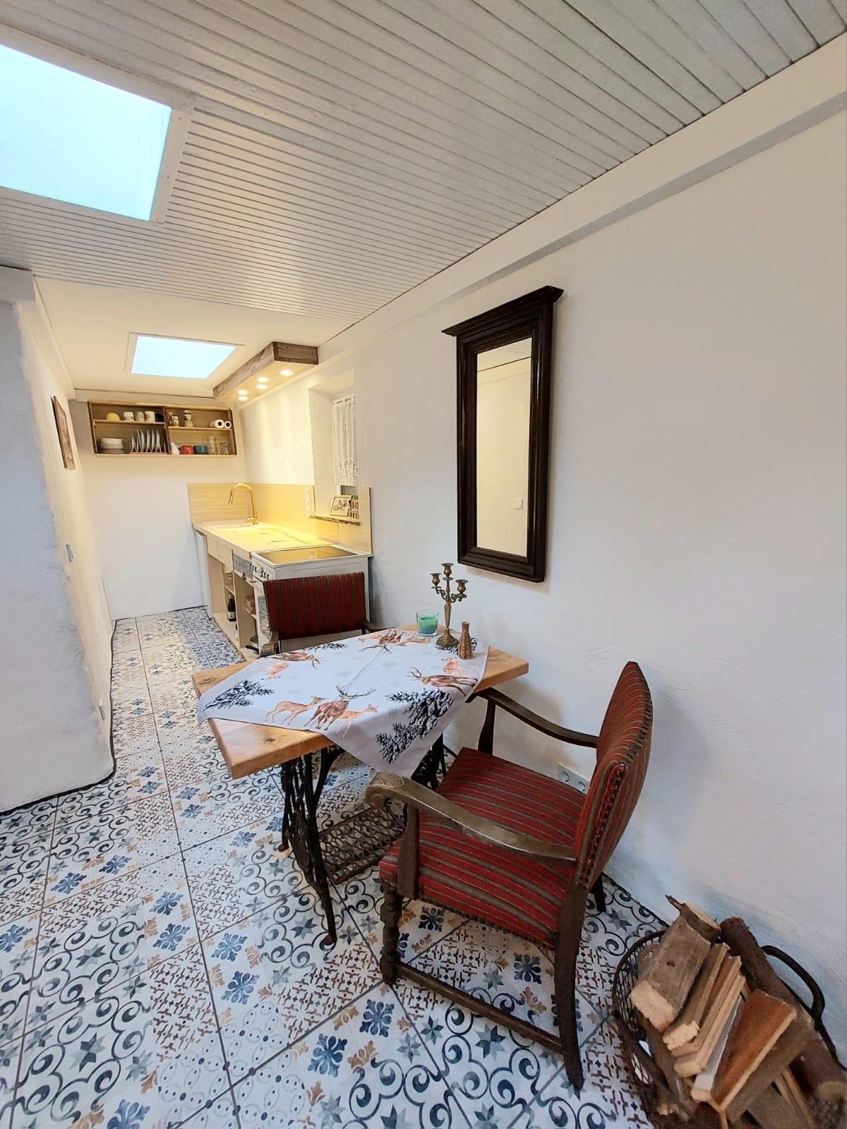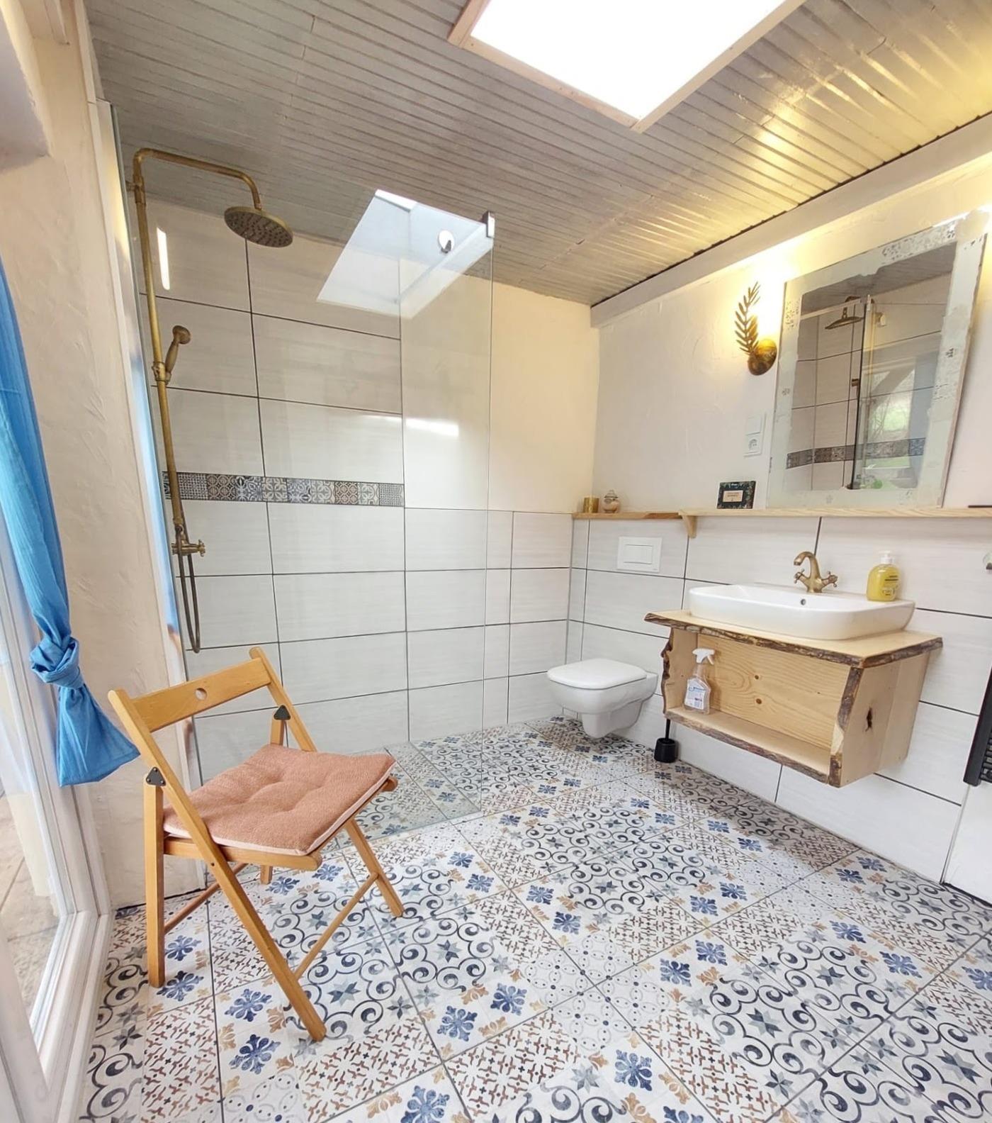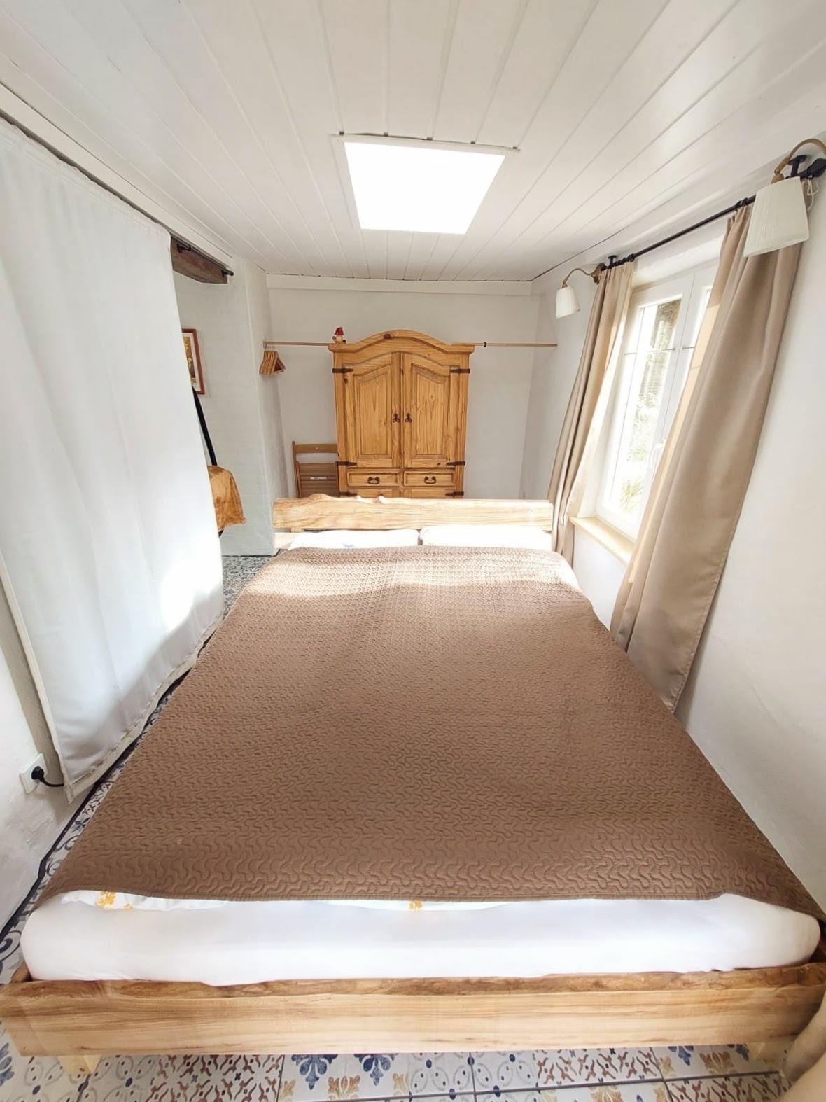 Das gemütlich wirkende Haus fügt sich harmonisch in die natürliche Umgebung ein. Von der Überdachten Terrasse gelangen Sie in den Wohnschlafbereich. Dieser ist mit einem Sofa, Sat-TV, Kaminofen, einer offenen Küche und Esstisch ausgestattet. Dieser Raum bietet einen idealen Ort zum gemütlichen Beisammensein. In dem rustikalen französischen Bett können Sie sich richtig ausschlafen. Das Bad ist mit einer großen, ebenerdigen Dusche ausgestattet. Die außergewöhnliche Einrichtung zeichnet sich durch viel Liebe zum Detail aus.