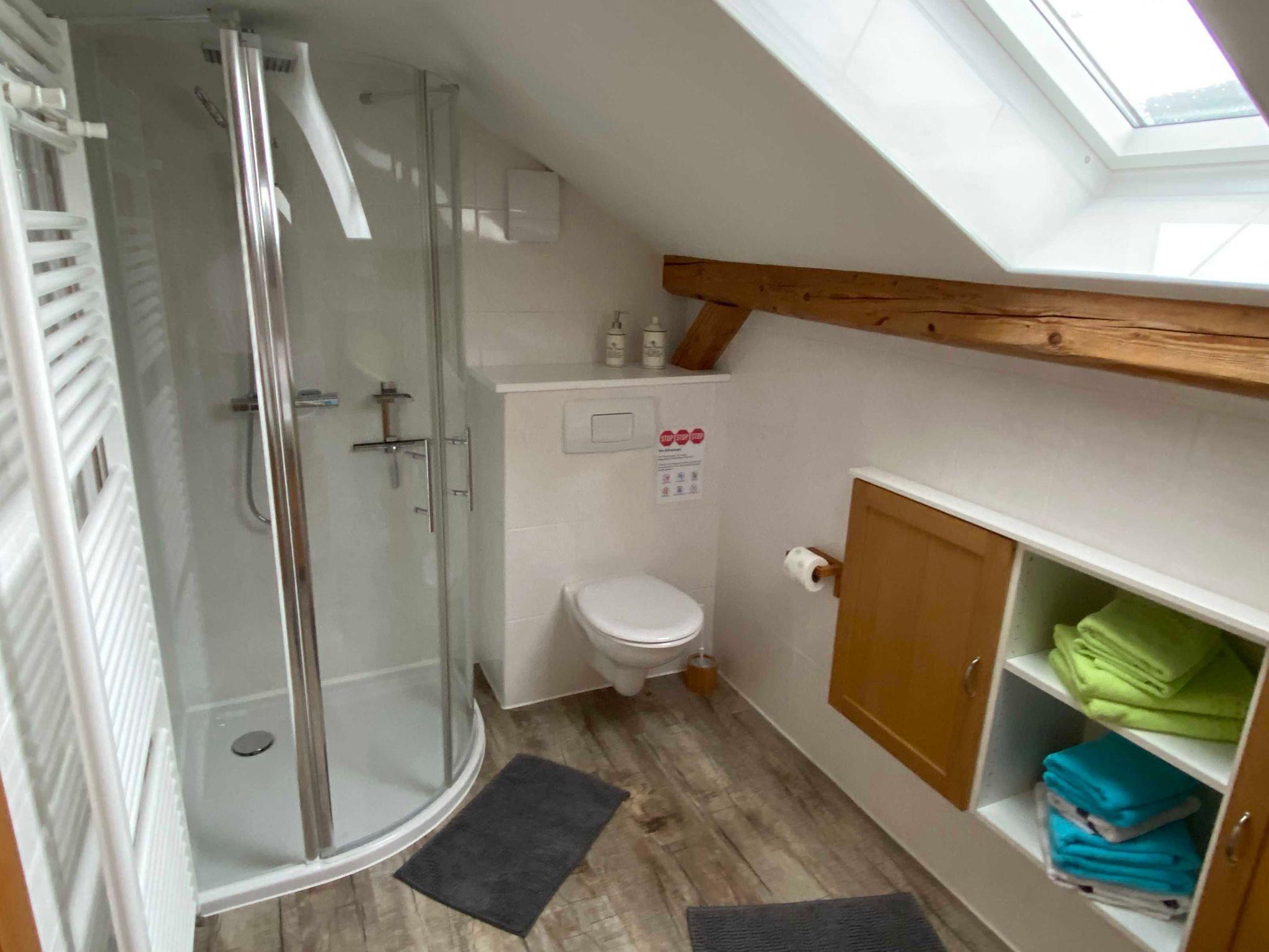 Das Bad ist mit einer ebenerdigen Dusche, einem großen Wandschrank, einem Waschtisch und natürlich einem WC ausgestattet.