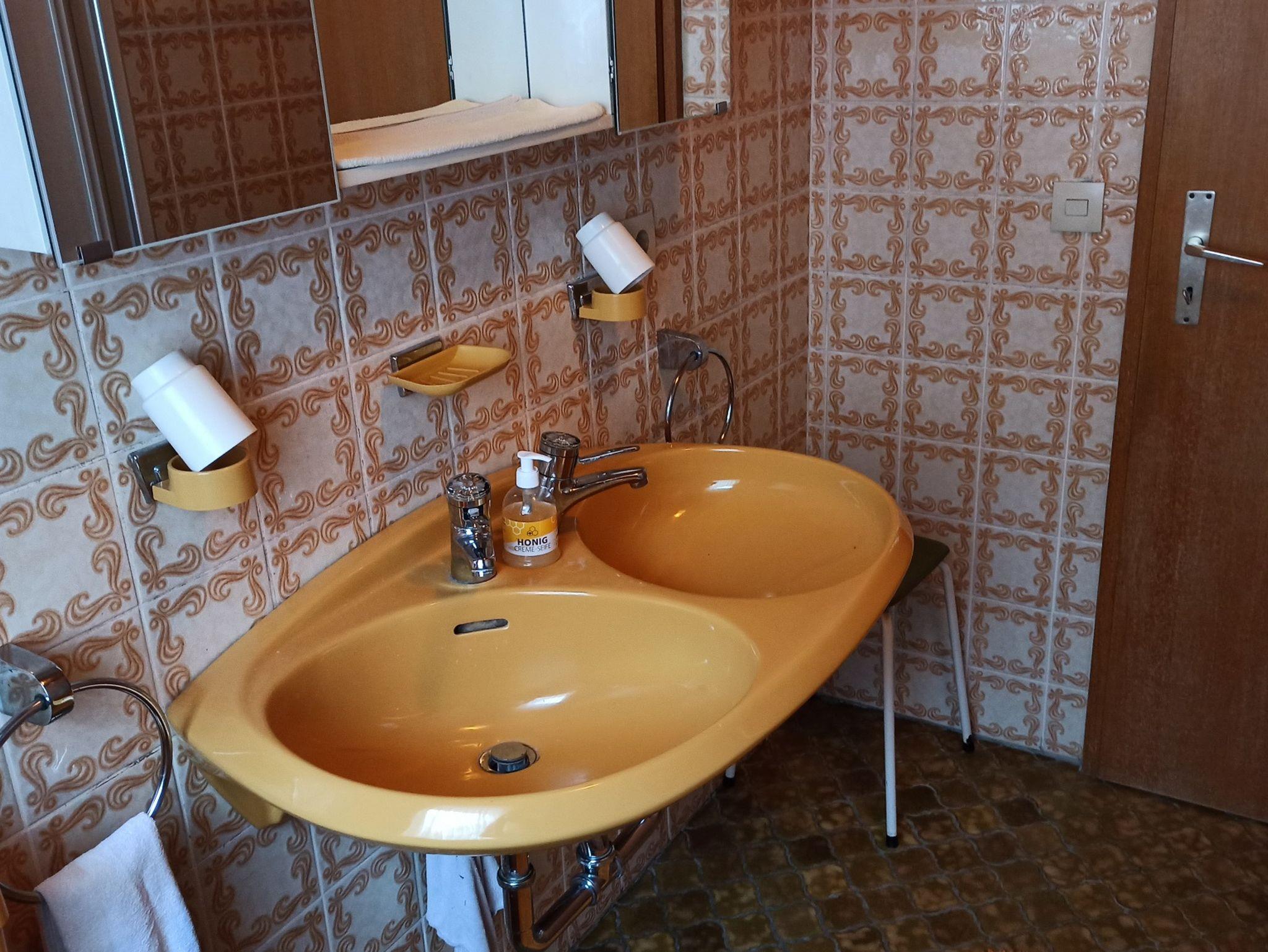 Das Gemeinschaftsbad mit Badewanne und Toilette befindet sich genau gegenüber. Daneben rechts eine zusätzliche Gemeinschaftstoilette. Neben dem Bad links ist die Gemeinschaftsküche mit Kühlschrank, Backofen, Mikrowelle, 4 Kochplatten, Wasserkocher, Kaffeemaschine, Geschirr, Töpfe, Pfannen, Besteck etc.