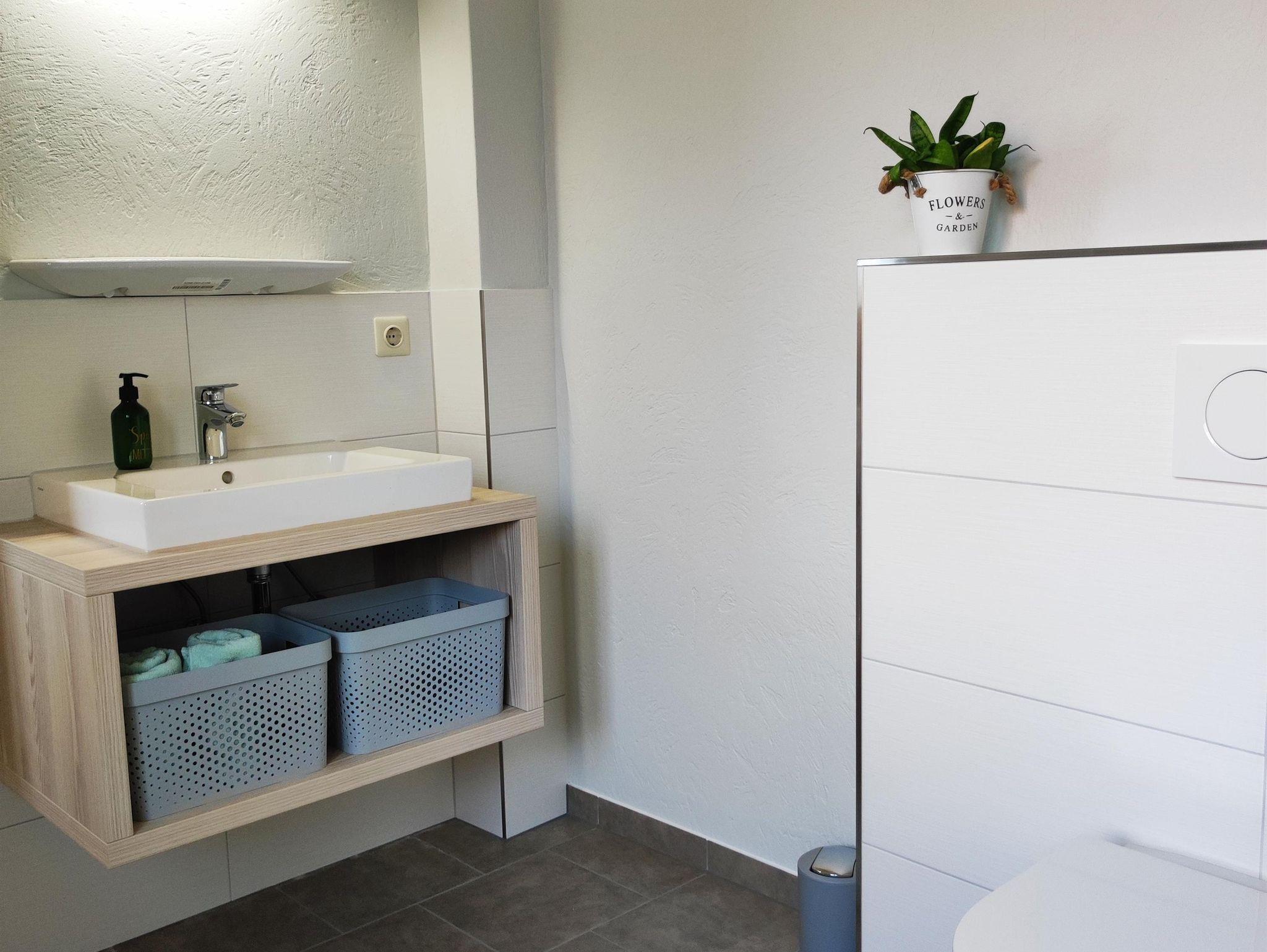 - Ein Bad mit Duschvorleger, Föhn, 1 Rolle Toilettenpapier, Handwaschseife