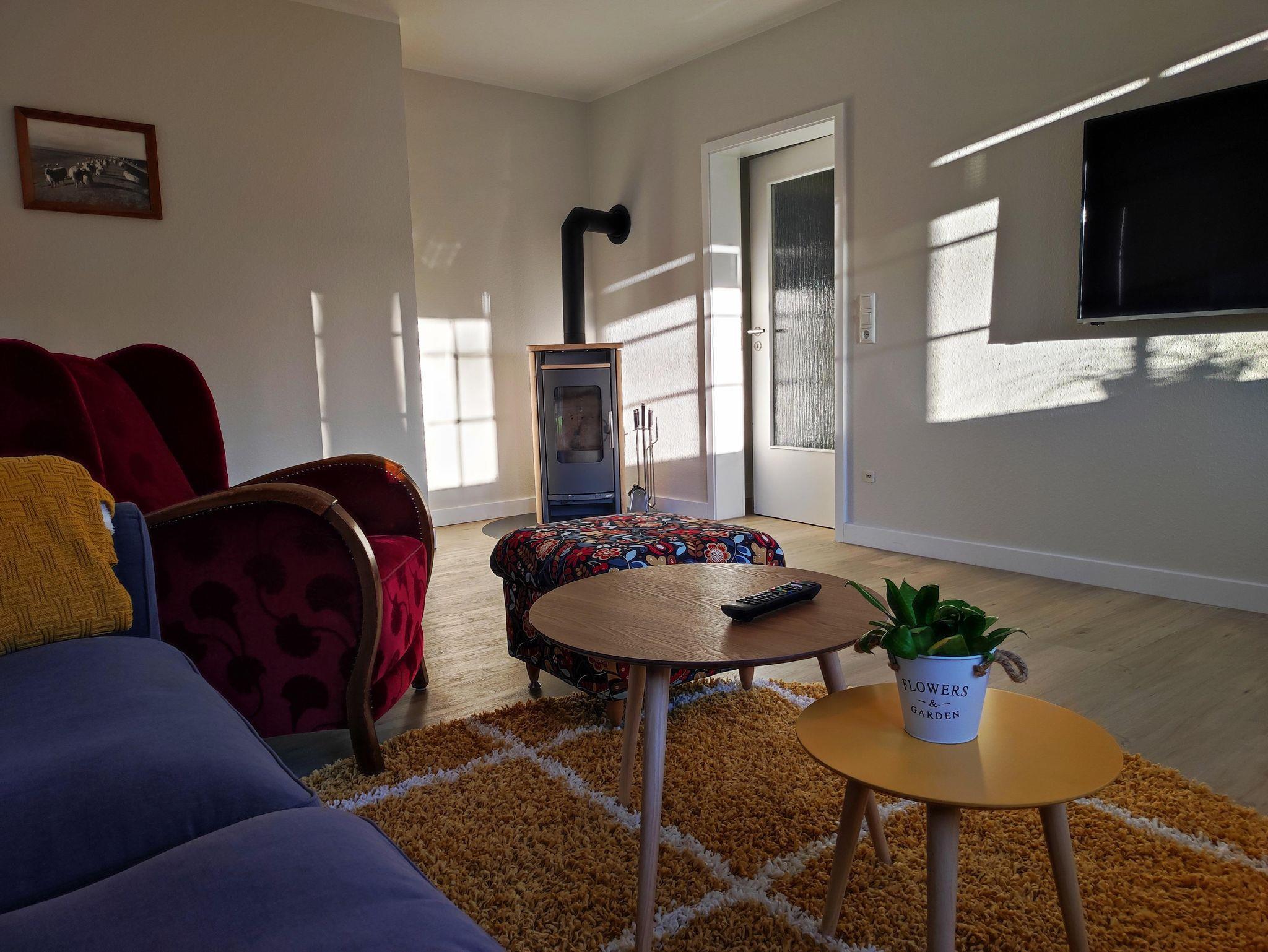 - Ein Wohnzimmer mit gemütlichem Sofa (Schlafsofa als Schlafgelegenheit für die 3. Person geeignet) und Ohrenbackensessel und großem Flachbildschirm. Ein Kaminofen sorgt für gemütliche Stimmung am Abend.