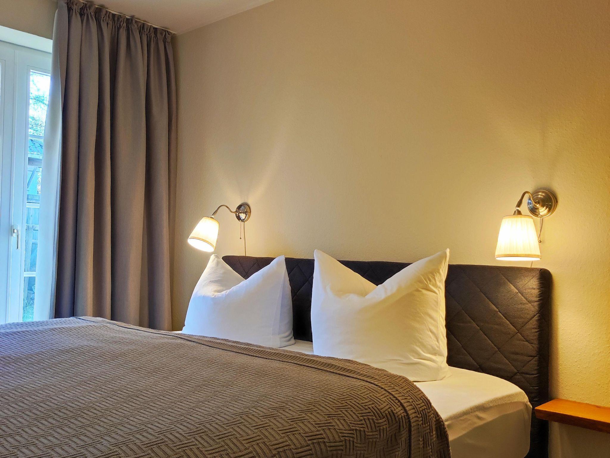 - Ein Schlafraum mit Boxspringbett mit Federkissen und waschbaren Bettdecken im Maß 135×200 cm. Auf Anfrage können Sie auch gern eine Bettdecke im Maß 135×220 cm erhalten. Die Matratze hat ein Maß von 180x200cm und ist selbstverständlich mit Nässeschutz belegt.