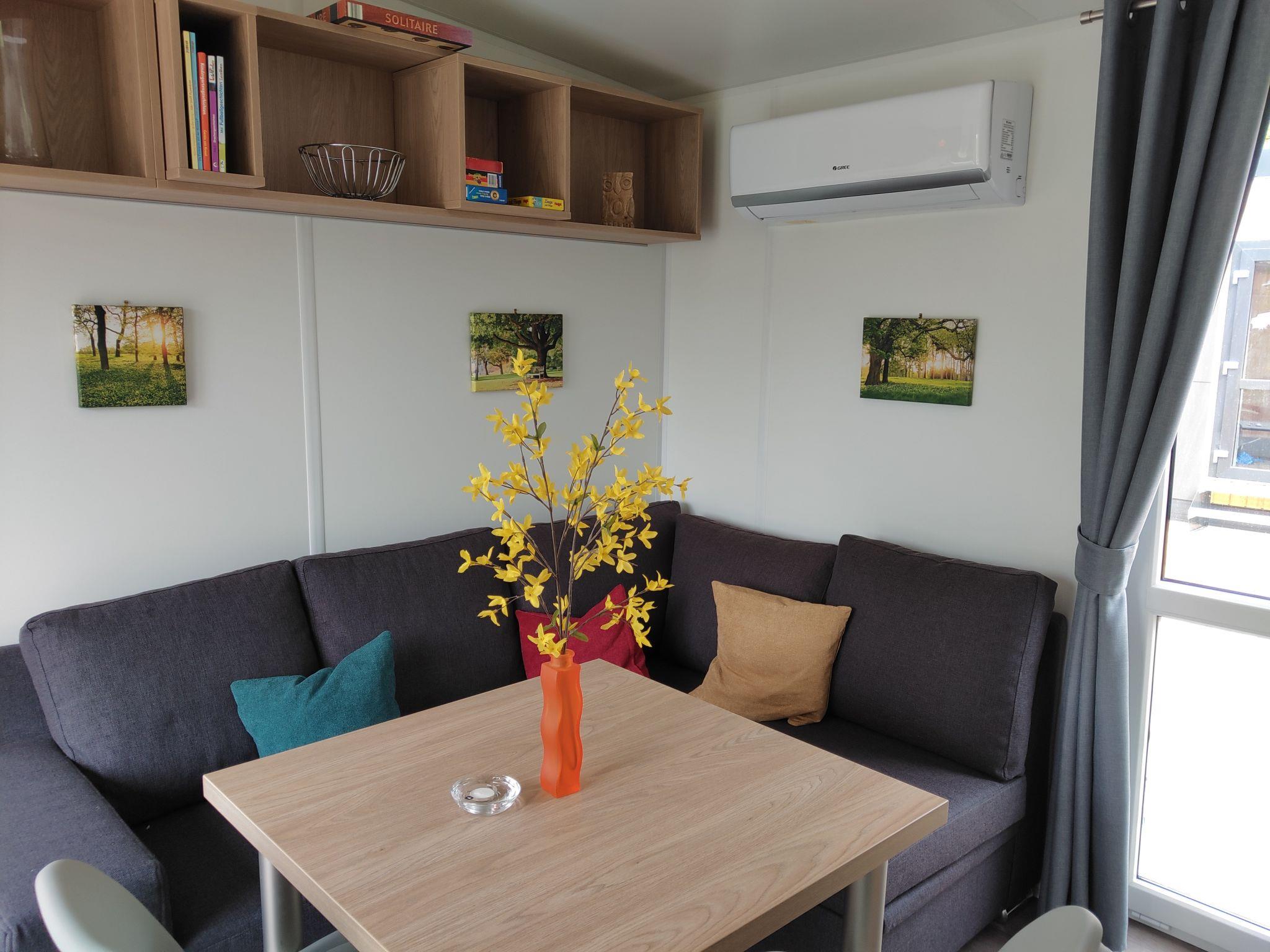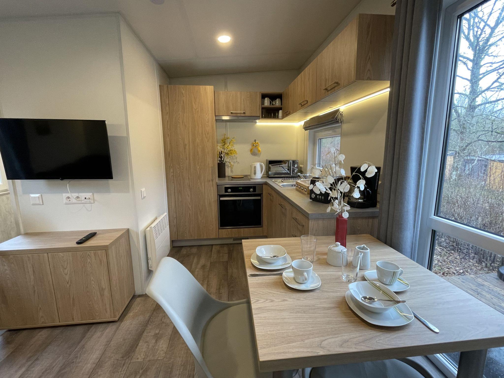 "Tiny Haus Eulenheim", 2-room mobile home 25 m2. Object suitable for 2 adults + 2 children. Cosy furnishings: living/sleeping room with 1 double sofabed and satellite TV. Exit to the terrace. 1 room with 1 french bed (140 cm, length 200 cm). Open kitchen (oven, 2 induction hot plates, toaster, kettle, microwave, electric coffee machine). Shower/WC. Electric heating, air-conditioning. Terrace. Terrace furniture. Please note: non-smoking house. Maximum 2 pets/ dogs allowed. Smoke alarm. Uwaga: Internet WLAN polaczenie moze byc ograniczone w zaleznosci od przepustowosci lacza.