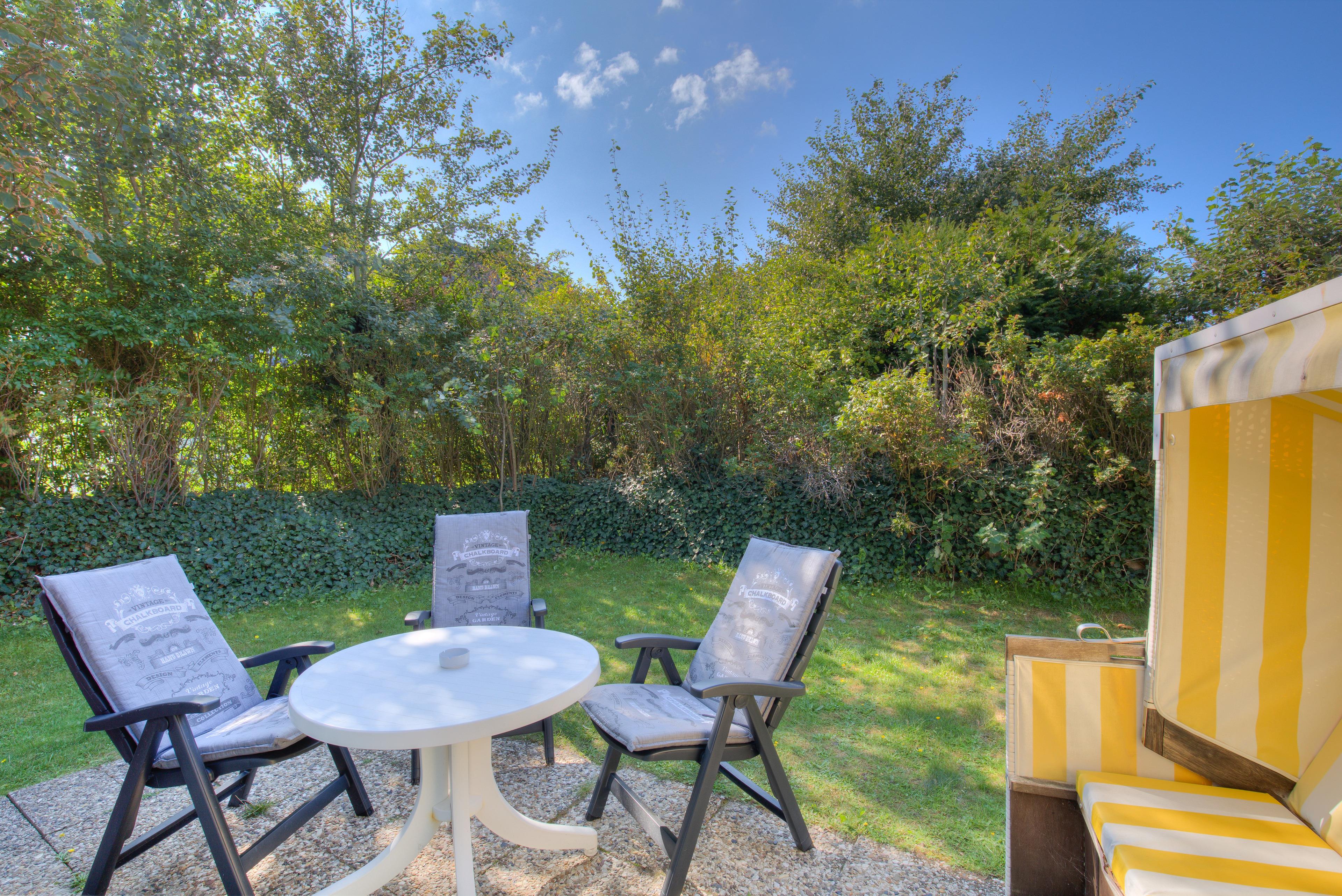 Ein großes, modernes Duschbad ergänzt das Angebot. Die Sylter Sonnenstunden genießen Sie auf der Süd-Westterrasse mit Gartenmöbel und Strandkorb.