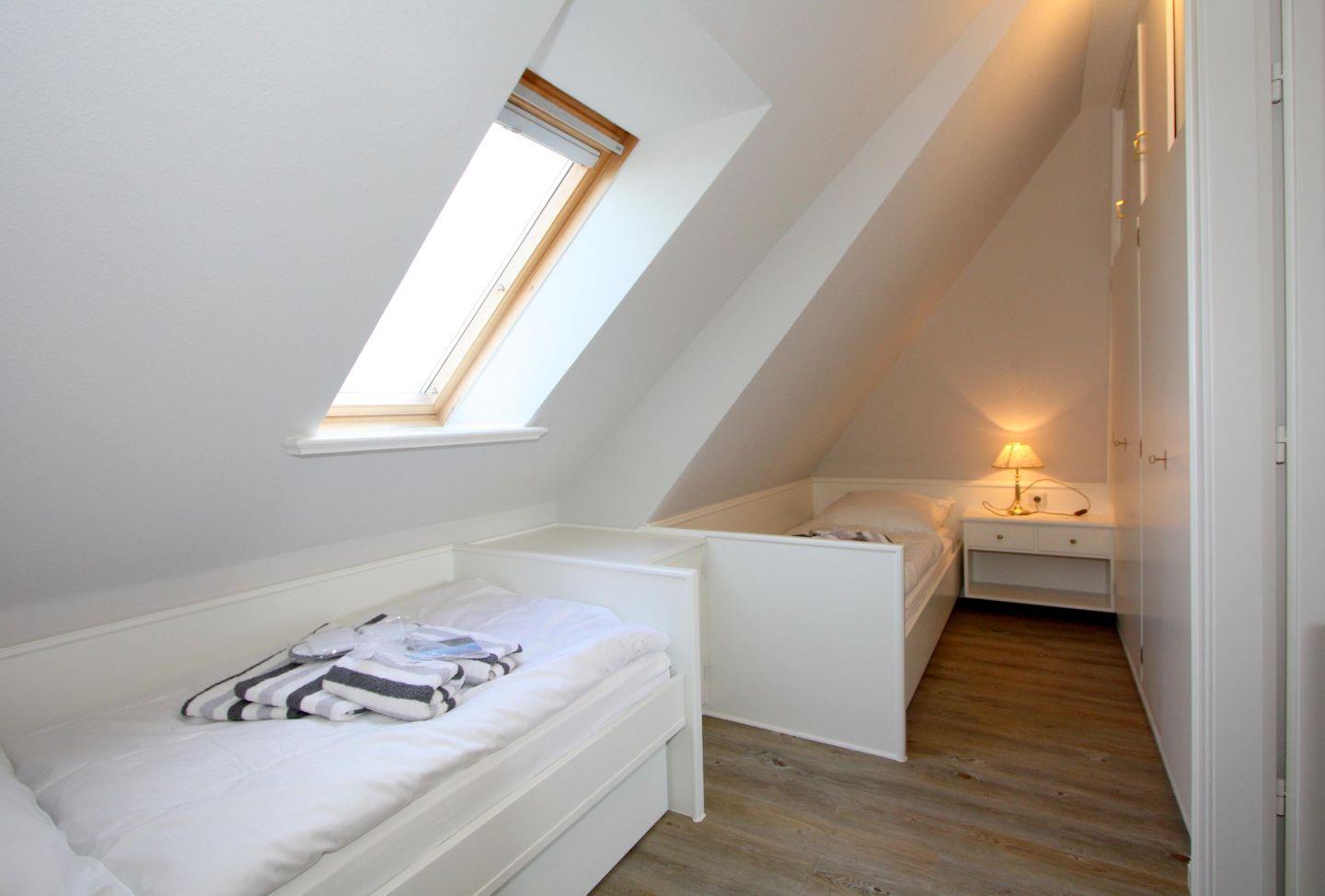 Schlafzimmer 2: Behagliches Schlafzimmer mit zwei Einzelbetten, großem Schrank und Dachfenster.