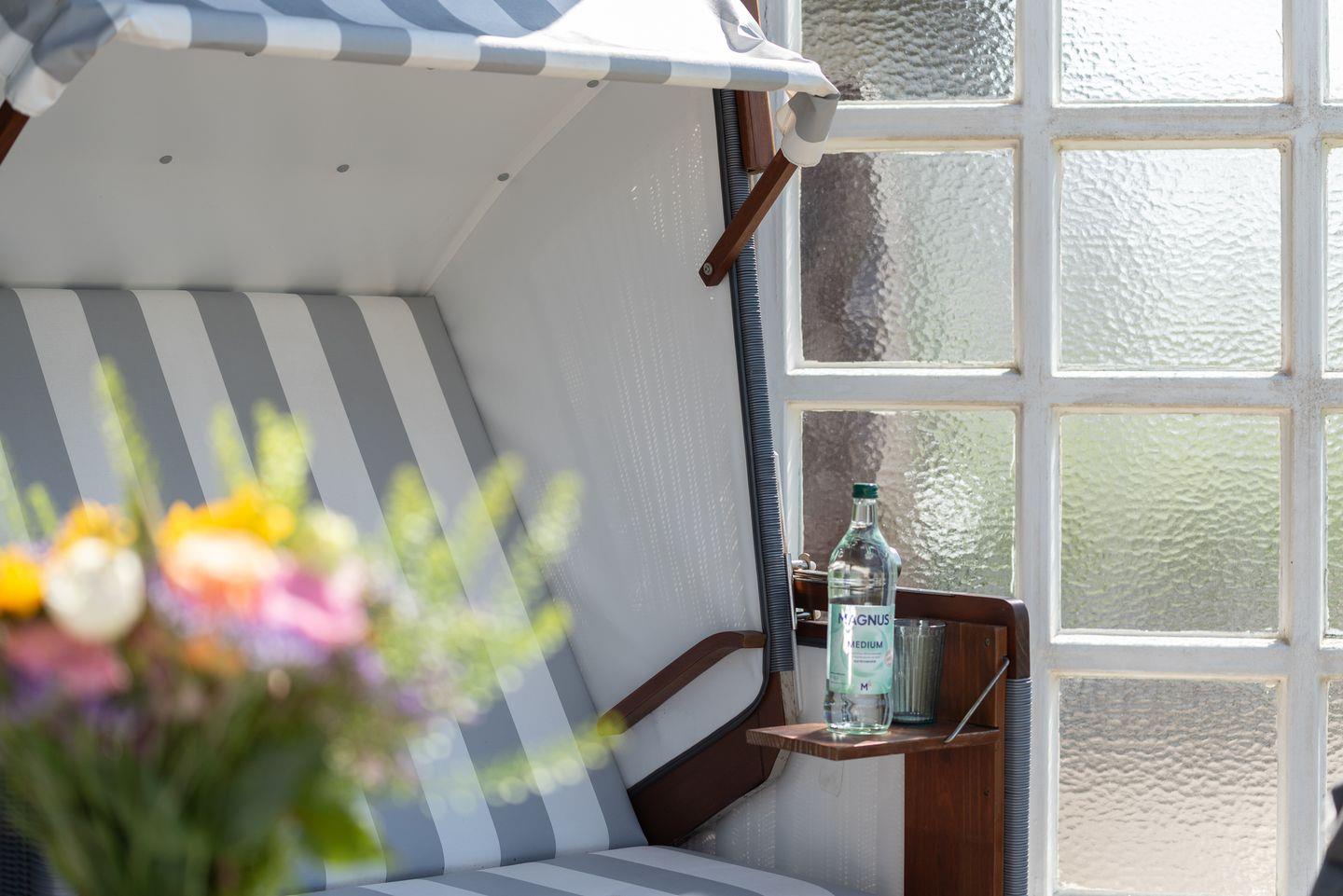 Garten: Diese Ferienwohnung bietet Ihnen einen schönen Garten mit Terrasse, einem Strandkorb und Gartenmöbeln.