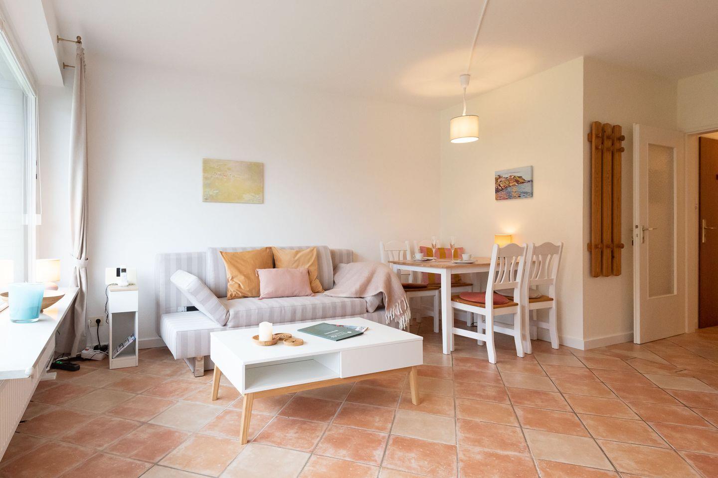 Koch-/Ess-/Wohnbereich: Neu renovierter Wohnbereich mit TV und separater Essecke. Die helle Pantryküche ist mit einer gemütlichen Bar ausgestattet. Das Schlafsofa bietet Platz für zwei Personen. Nach Süden ausgerichtete Sonnenterrasse mit einem Strandkorb und Gartenmöbeln.