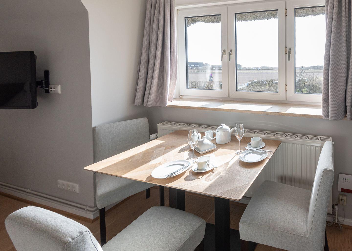 Die kleine moderne Einzimmerwohnung mit 32 m² bietet 2 Personen im Reetdachhaus Passat unbeschwerten Sylturlaub. Die Panoramablickwohnung befindet sich in unmittelbarer Strandnähe am nördlichen Ortsrand von Wenningstedt.